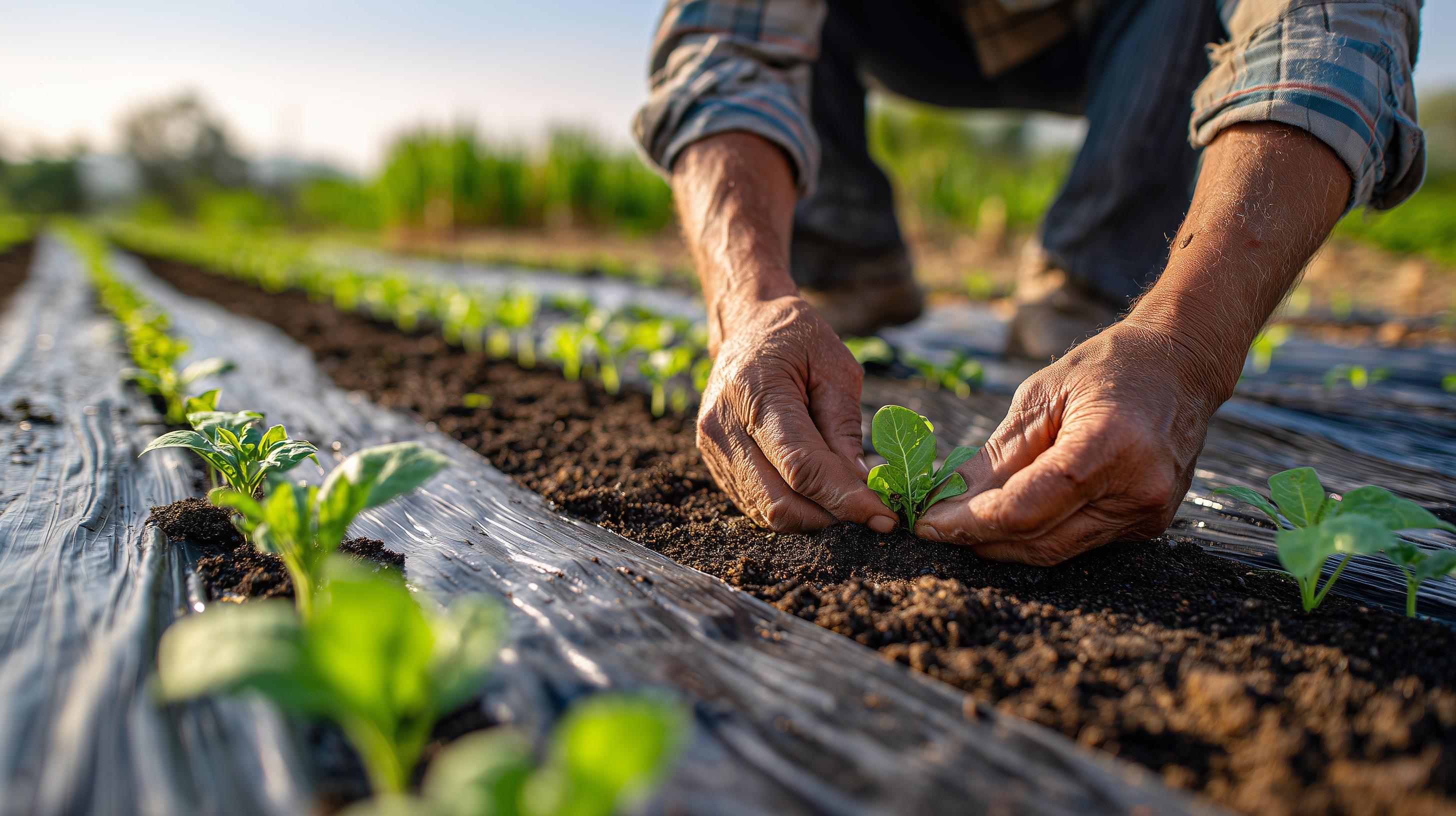 Dieses Foto zeigt einen Biobauern, der sorgfältig junge Gemüsepflanzen in den Boden setzt. Die Hände des Mannes sind erdverschmiert, was auf die körperliche Arbeit im Feld hinweist. Der Gemüsegarten erstreckt sich in Reihen in die Tiefe des Bildes, gesäumt von grünen Blättern und Erde. Die warmen Farbtöne und natürliche Umgebung vermitteln ein Gefühl von Natürlichkeit und Nachhaltigkeit.