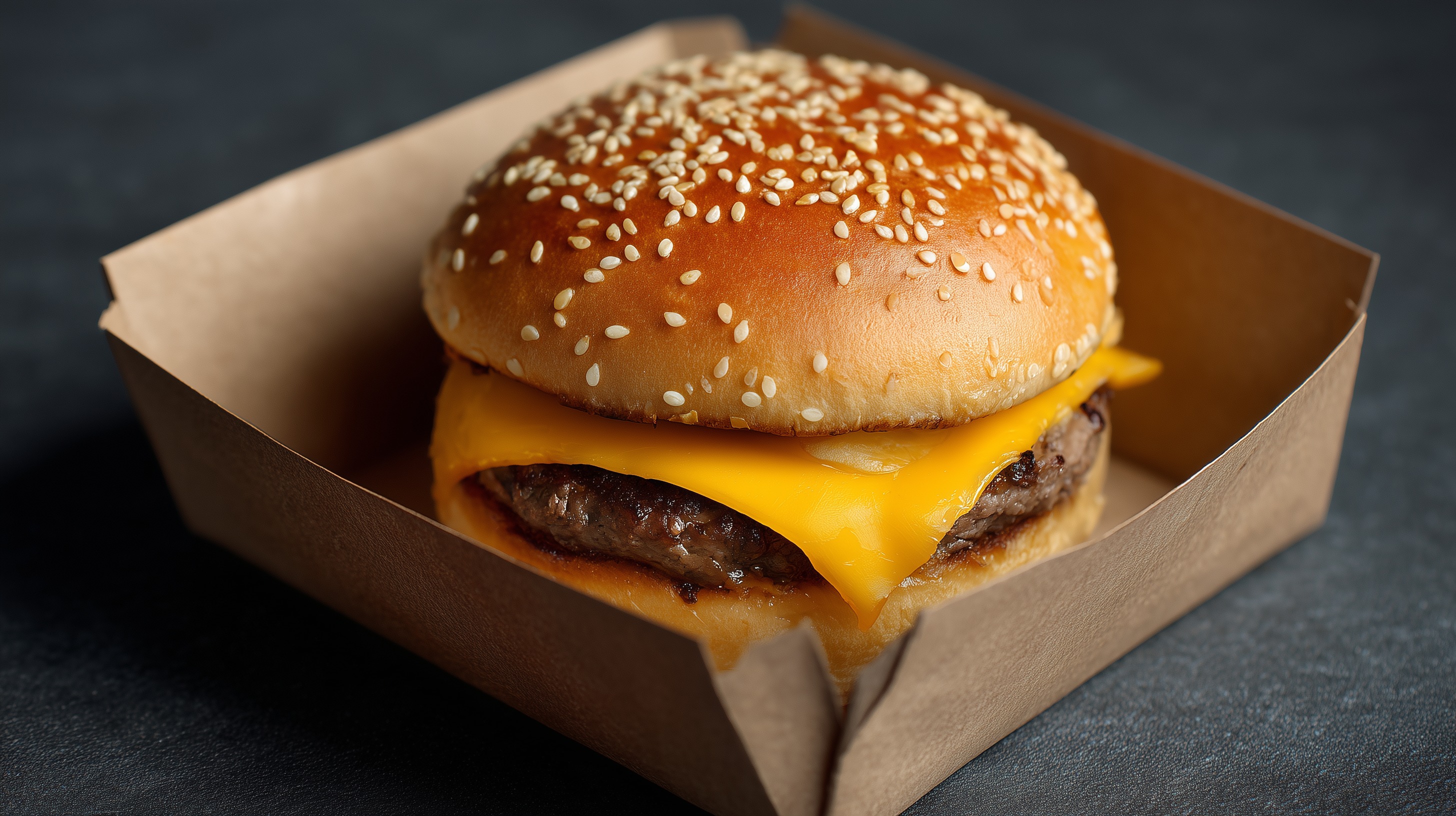 Dieses Foto zeigt einen leckeren Hamburger mit Sesam-Brötchen. Das saftige Fleischpatty ist mit einem Scheibe Käse belegt und zwischen den goldbraunen Brötchenhälften platziert. Optisch ergänzt ein Stück Paprika den appetitlichen Anblick. Der Hamburger wurde in einer schlichten Papierverpackung angerichtet, vor einem dunklen Hintergrund fotografiert, wodurch die orange-bräunlichen Farbtöne des Burgers besonders hervorstechen. Dieses hochwertige Stockfoto eignet sich hervorragend für die Verwendung in Blogs, sozialen Medien oder Präsentationen zum Thema Fastfood, Kulinarik oder Genuss. Mit den passenden Keywords lässt es sich optimal für SEO-Maßnahmen einsetzen.