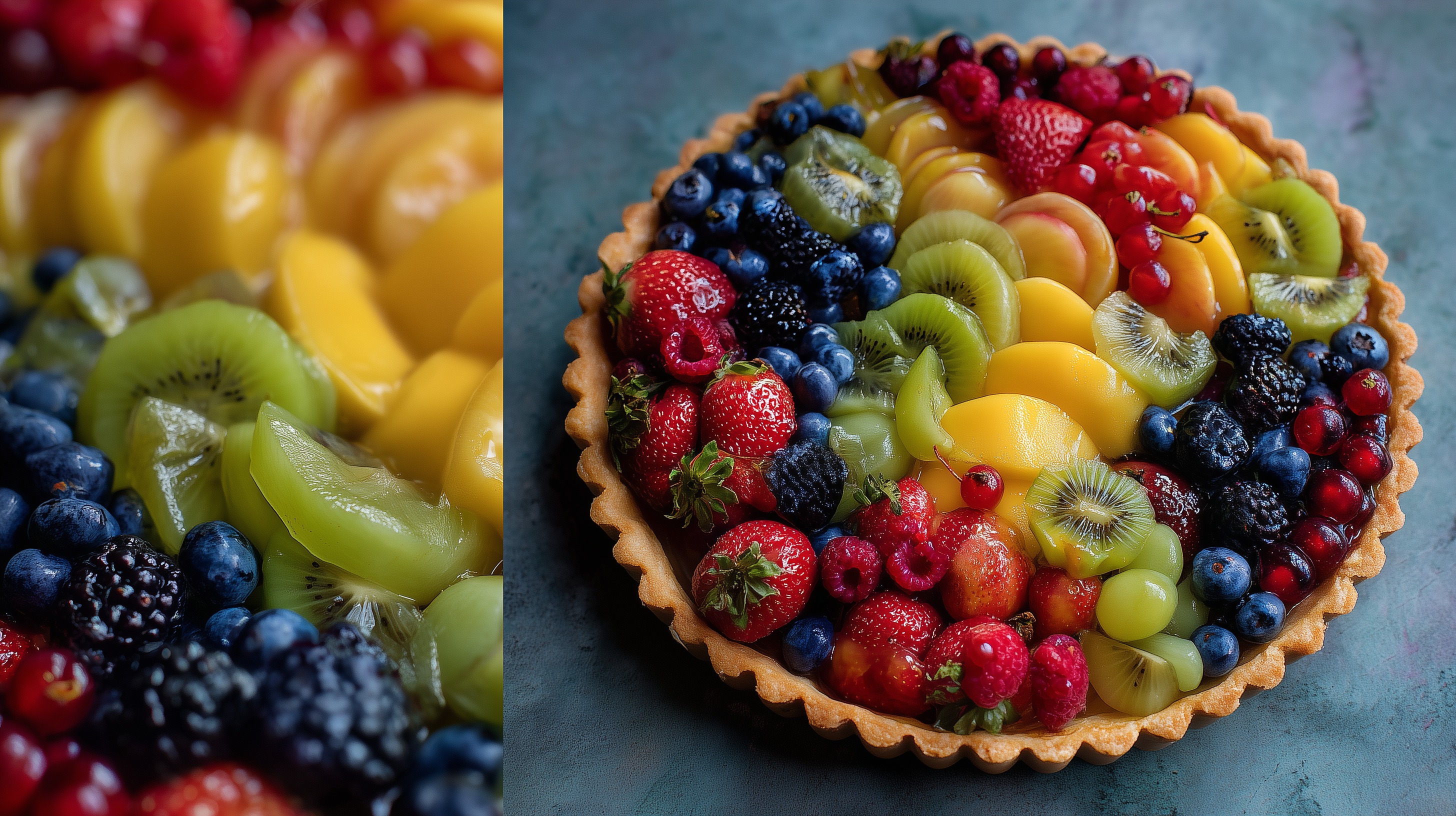 Dieses Foto zeigt eine wunderbare Mischung an frischem Obst in einer klassischen Tarteschale. Die Komposition ist sehr ausgewogen und farblich perfekt aufeinander abgestimmt. Man sieht eine Vielfalt an Früchten wie Erdbeeren, Brombeeren, Heidelbeeren, Kiwi, Zitrusfrüchte und weitere Beerensorten, die liebevoll und dekorativ angerichtet wurden.