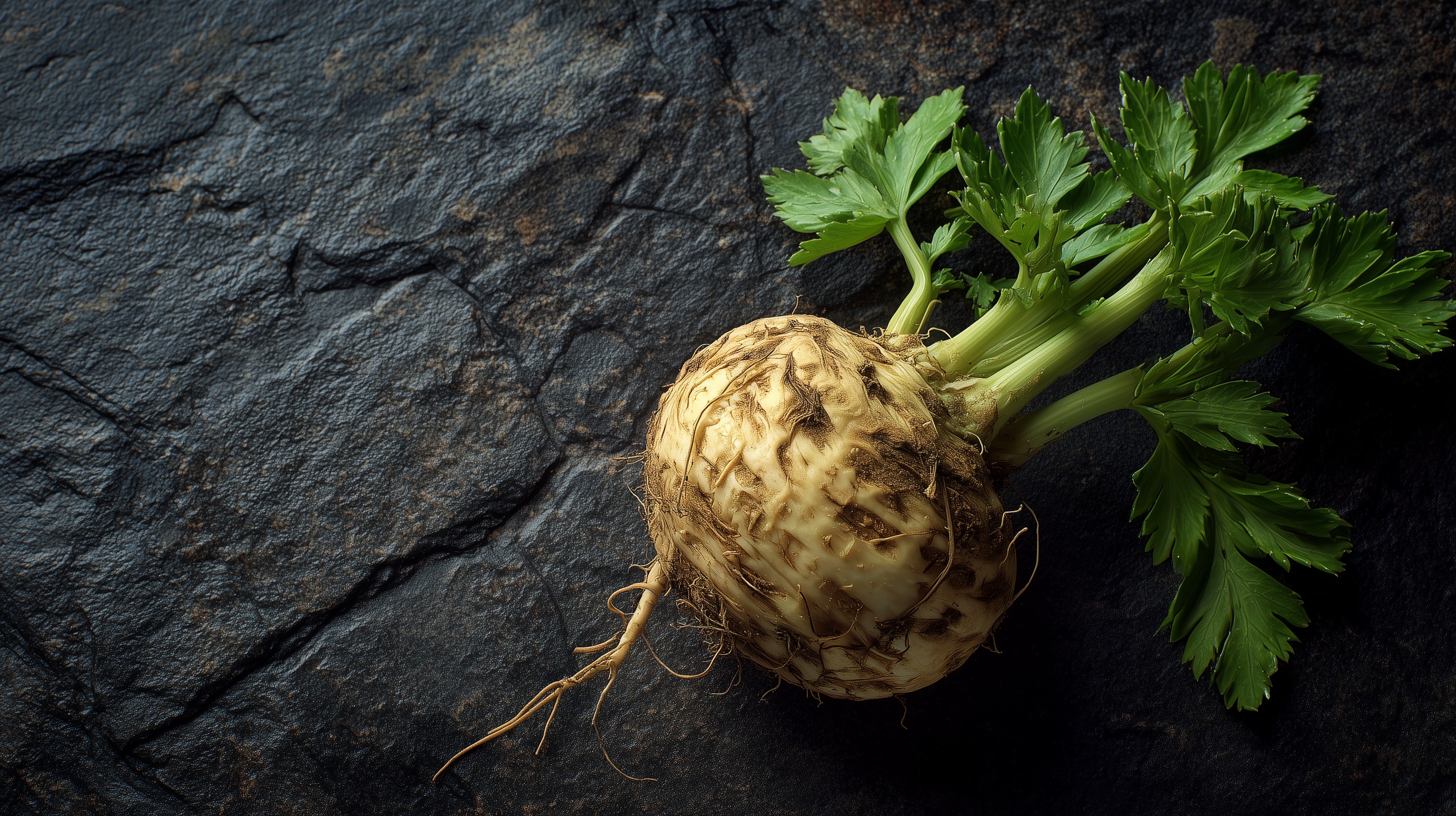 Dieses Foto zeigt einen frischen Sellerie auf einem dunklen Schieferstein. Der Sellerie ist ganz mit seinen grünen Blättern und der knolligen Wurzel zu sehen. Die natürlichen Farben in Grün, Gelb und Schwarz schaffen eine einfache, aber stimmungsvolle Komposition. Das Bild vermittelt Frische, Natürlichkeit und die Verwendung unverarbeiteter Zutaten in der Küche. Es eignet sich hervorragend für Blogbeiträge, Social-Media-Posts oder Newsletter zum Thema gesunde Ernährung, Kochrezepte und Zutatenportraits. Der freie Raum um den Sellerie herum bietet viel Platz für Texte, Überschriften oder andere grafische Elemente.
