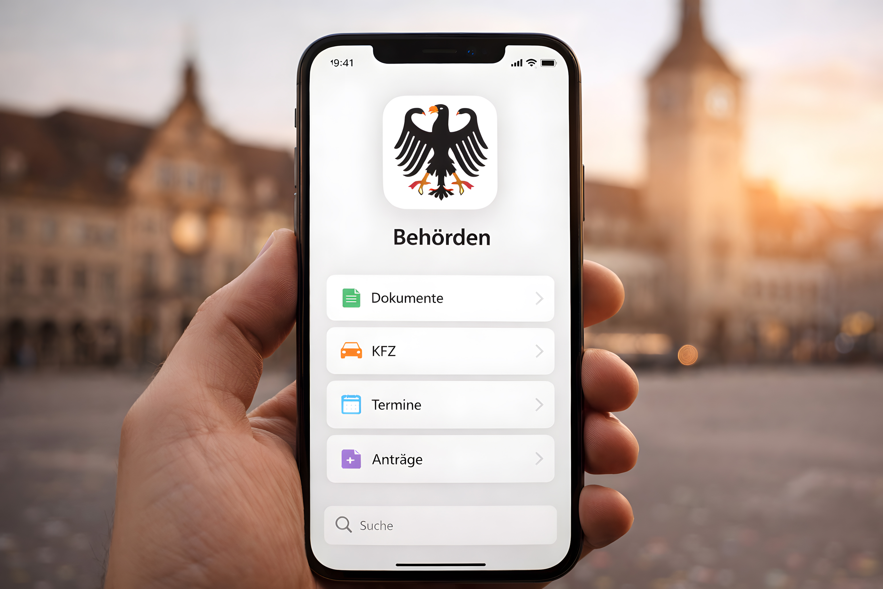 Dieses Foto zeigt eine Smartphone-Anwendung für den Zugriff auf Verwaltungsinformationen und -dokumente. Die App bietet Zugriff auf verschiedene Funktionen wie Dokumentenablage, Kfz-Verwaltung, Terminkalender und Antragsstellung. Der Nutzer kann mit der intuitiven App schnell und einfach die benötigten Informationen oder Dienste der Behörde abrufen, ohne physisch vor Ort sein zu müssen. Die digitale Verwaltungsanwendung steht symbolisch für die Modernisierung und Effizienzsteigerung im öffentlichen Sektor durch den Einsatz mobiler Technologien. Die Lösung kann in Blogs, Social-Media-Kanälen, Präsentationen oder Newslettern eingesetzt werden, um die Digitalisierung von Verwaltungsprozessen zu veranschaulichen und deren Mehrwert für Bürger und Organisationen aufzuzeigen.