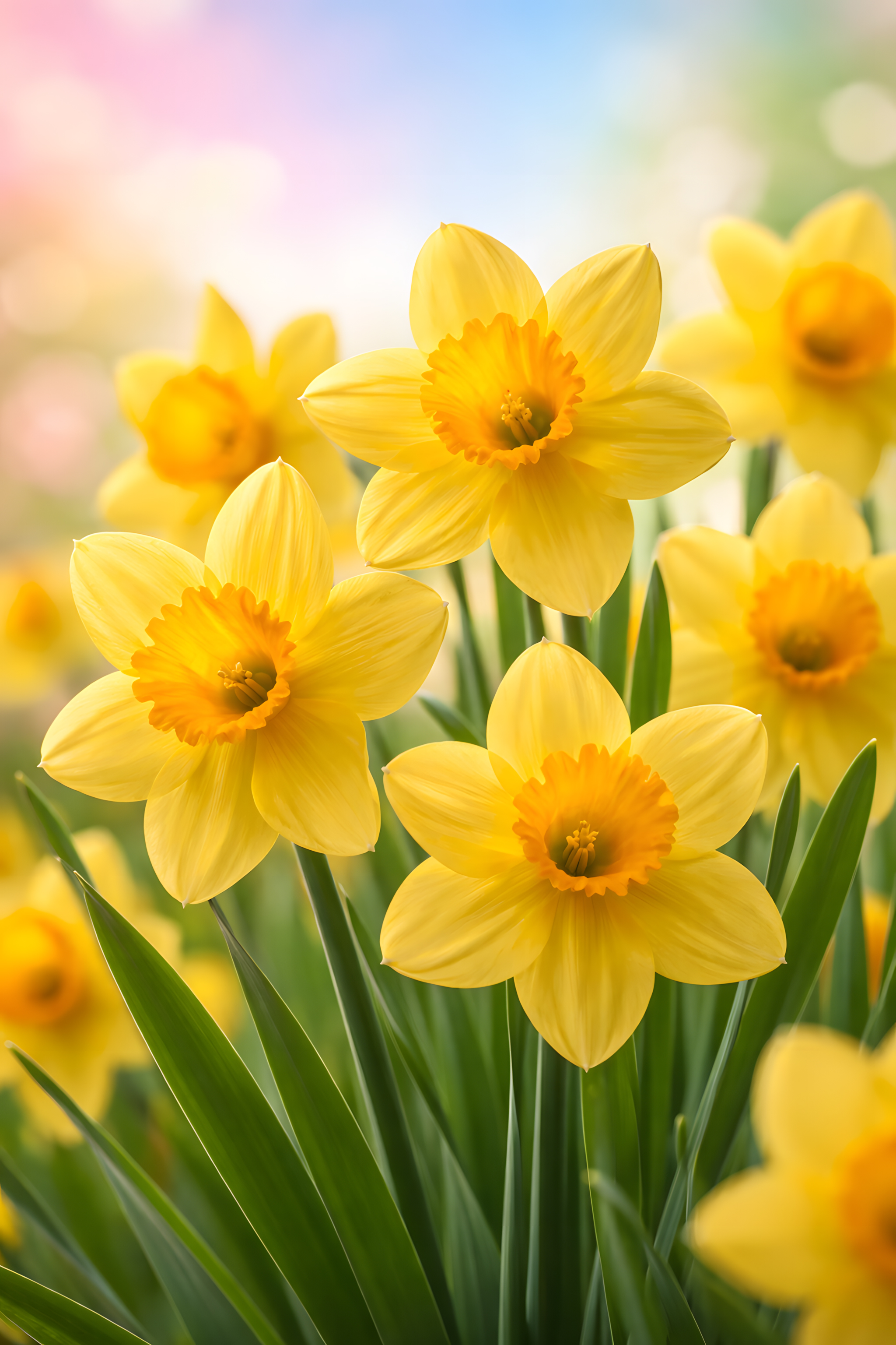 Dieses Bild zeigt eine üppige Wiese voller gelber Narzissen. Die Blumen sind in strahlenden Gelbtönen und Dotterfarben gehalten, die einen intensiven Kontrast zu den grünen Blättern bilden. Die Perspektive ist nah und führt den Blick des Betrachters direkt auf die prachtvollen Blüten. Durch die weiche Unschärfe im Hintergrund liegt der Fokus ganz auf den Blumen, die in ihrer Fülle und Farbintensität eine geradezu lebendige Ausstrahlung haben. Dieses Bild vermittelt eine fröhliche, frühlinghafte Stimmung und eignet sich hervorragend für die Verwendung in Blogs, auf Social Media-Kanälen, in Newslettern oder Präsentationen zu den Themen Frühling, Ostern, Natur und Blumen.