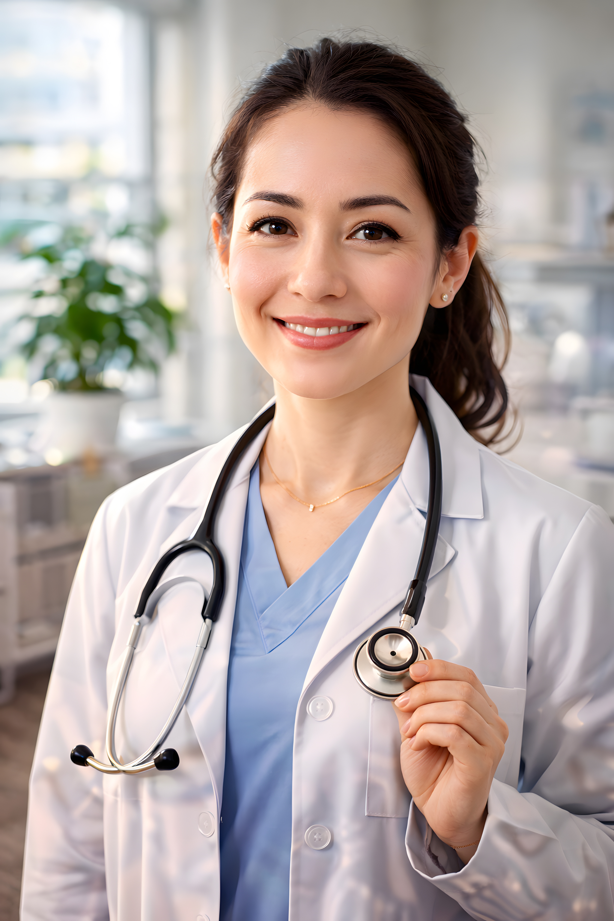 Das Bild zeigt eine lächelnde Ärztin in weißem Mantel, die ein Stethoskop in der Hand hält. Sie steht in einem hellen Büroraum mit Pflanzen und einem Fenster im Hintergrund. Ihre offene, freundliche Körpersprache und ihr professionelles Auftreten vermitteln Kompetenz und Vertrauenswürdigkeit.