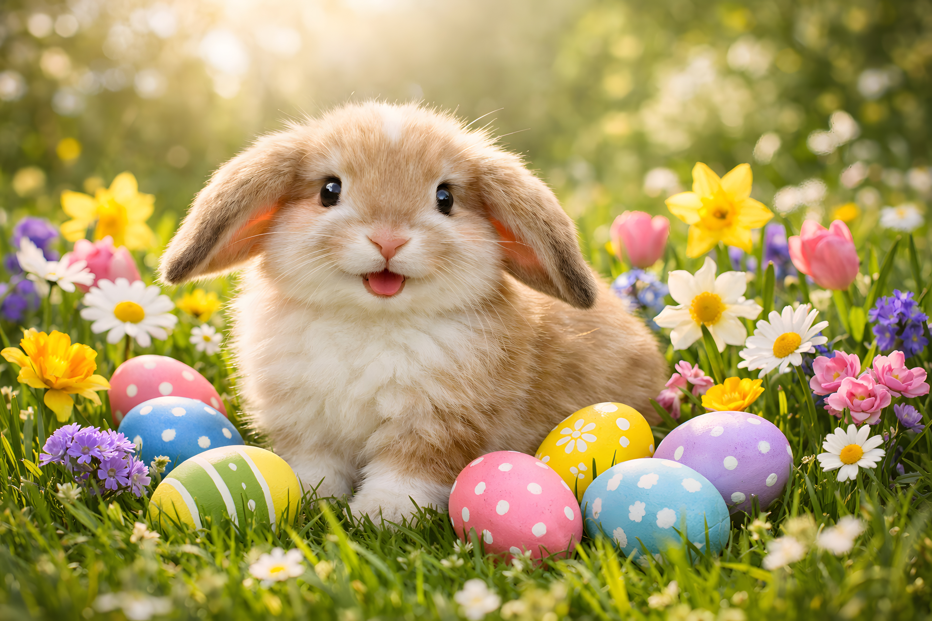 Das Bild zeigt ein niedliches, flauschiges Osterkaninchen, das von bunten Eiern und Frühlingsblumen umgeben ist. Das Kaninchen sitzt auf grünem Gras und blickt direkt in die Kamera, als würde es lächeln. Die kräftigen Farben der Eier und Blumen sowie die weiche Beleuchtung verleihen dem Bild eine märchenhafte Stimmung. Diese Aufnahme ist perfekt für Oster-Grußkarten, Einladungen, Blogger-Beiträge oder Social-Media-Posts rund um die Osterzeit. Das Motiv bietet eine stimmungsvolle Darstellung des Frühlings und der Freude, die Ostern bereitet.