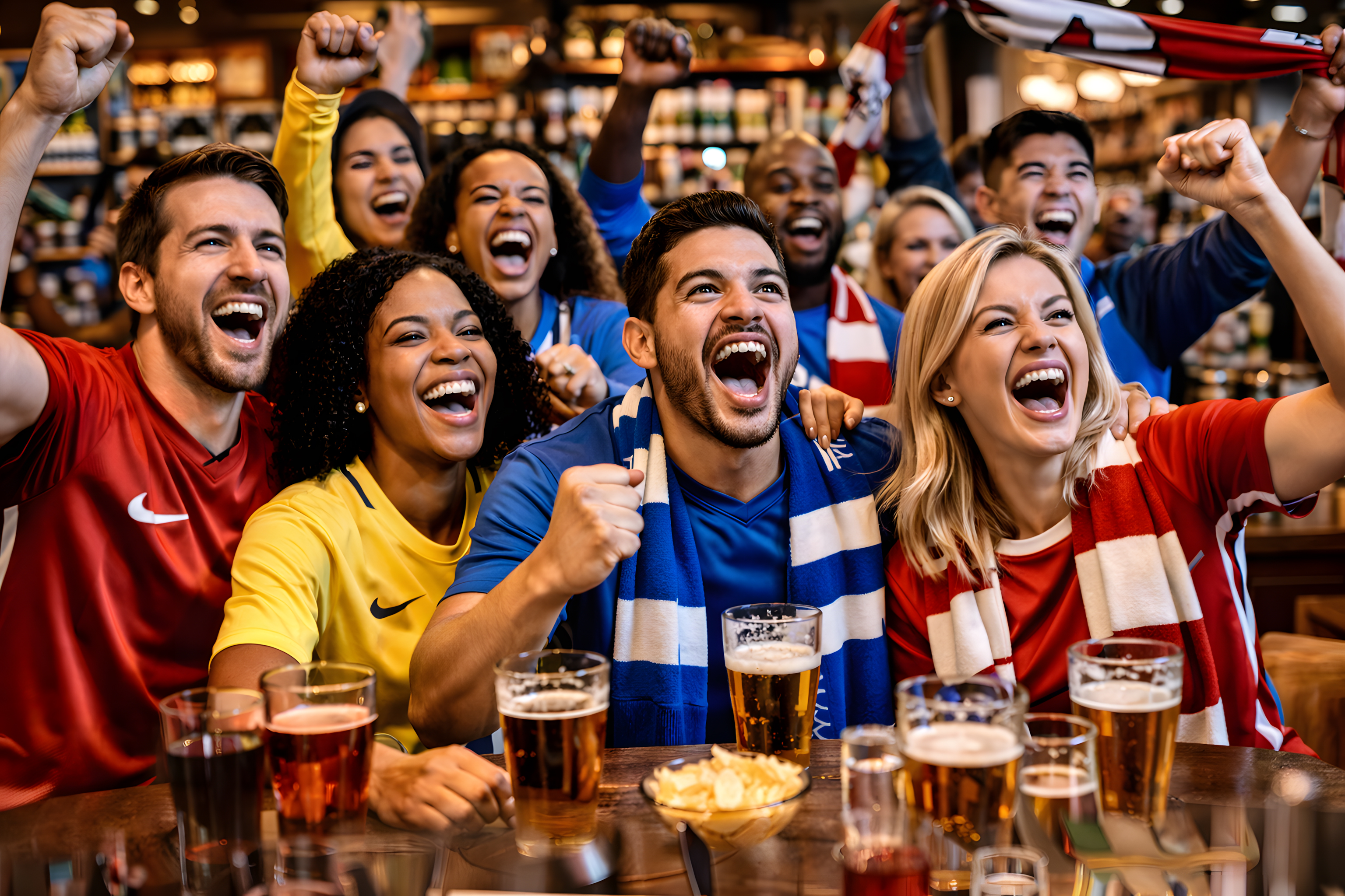 Das Bild zeigt eine Gruppe von enthusiastischen Fans, die in einer Bar zusammen ein Sportereignis verfolgen. Sie jubeln und lachen lautstark, da ihre Mannschaft offensichtlich ein Tor geschossen oder den Sieg errungen hat.