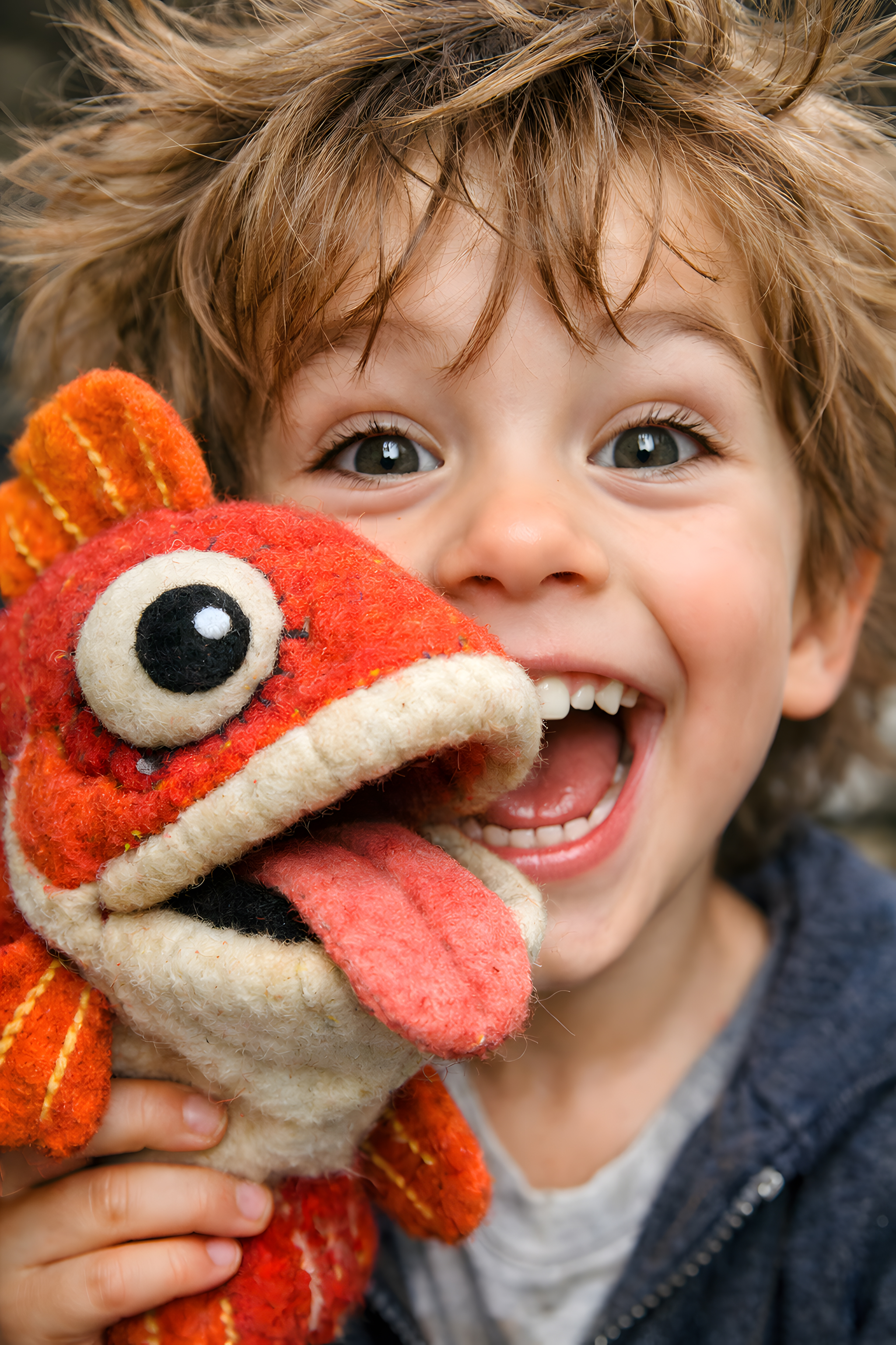 Das Bild zeigt ein fröhliches, lachendes Kind, das ein buntes Kuscheltier in Form eines Tieres fest in den Armen hält und es freudig anstrahlt. Das Gesicht des Kindes steht im Fokus der Aufnahme, sodass die Freude und der Spaß am Spielen deutlich zum Ausdruck kommen. Die auffällige Farbigkeit des Bildes, insbesondere durch das orange Plüschtier und die lebendigen Haare des Kindes, tragen zur stimmungsvollen Atmosphäre bei. Das Foto eignet sich hervorragend für den Einsatz in Blogs, sozialen Medien oder Präsentationen, um Fröhlichkeit, Kinderfreude und Lebensfreude zu vermitteln.
