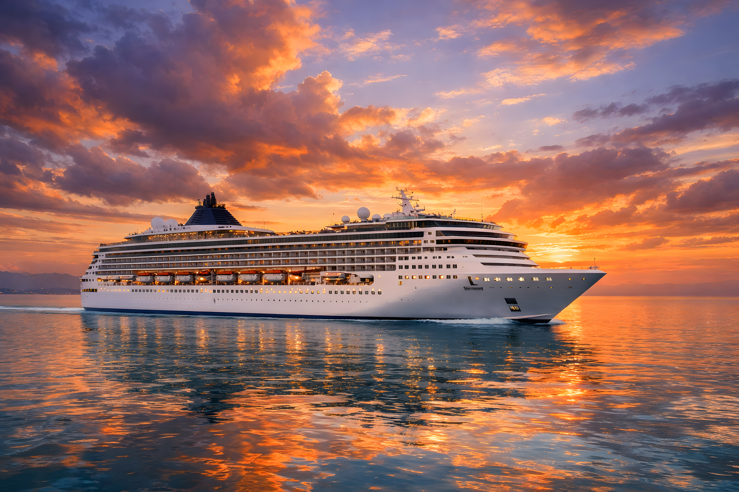 Dieses faszinierende Foto zeigt ein imposantes Kreuzfahrtschiff, das vor einem atemberaubenden Sonnenuntergang über das Meer gleitet. Die Farben des Himmels erstrahlen in einem prächtigen Feuerwerk aus orange, rot und violett, welches sich im ruhigen Wasser spiegelt. Das luxuriöse Schiff, mit seinen zahlreichen Kabinen, Restaurants und Annehmlichkeiten, erscheint wie ein schwimmendes Paradies. Diese Szene strahlt pure Entspannung und Freiheit aus und lädt dazu ein, den Alltag hinter sich zu lassen und in den Genuss einer unvergesslichen Kreuzfahrt zu kommen. Das Bild wäre ideal für die Gestaltung von Reiseprospekten, Urlaubsankündigungen in sozialen Medien oder Präsentationen zum Thema Tourismus.