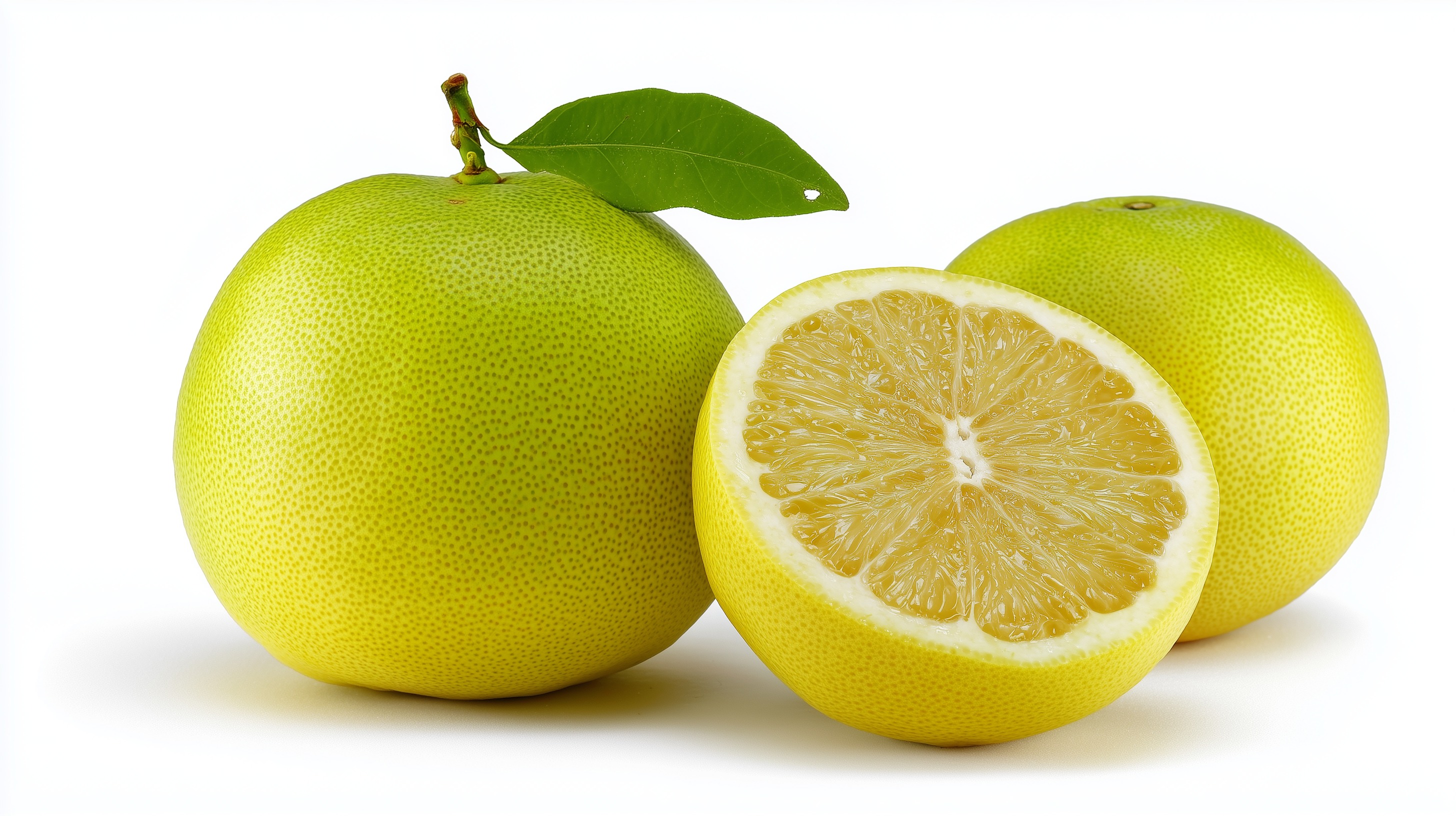 Diese saftigen Pomelos, auch Pampelmusen genannt, sind eine beliebte Zitrusfrucht mit herrlich erfrischendem Geschmack. Die dunkelgrünen Blätter und die gelbe, glatte Schale bilden einen schönen Kontrast auf dem weißen Hintergrund. Die aufgeschnittene Frucht zeigt ihr saftiges, helles Inneres, das reich an Vitaminen und Mineralstoffen ist.