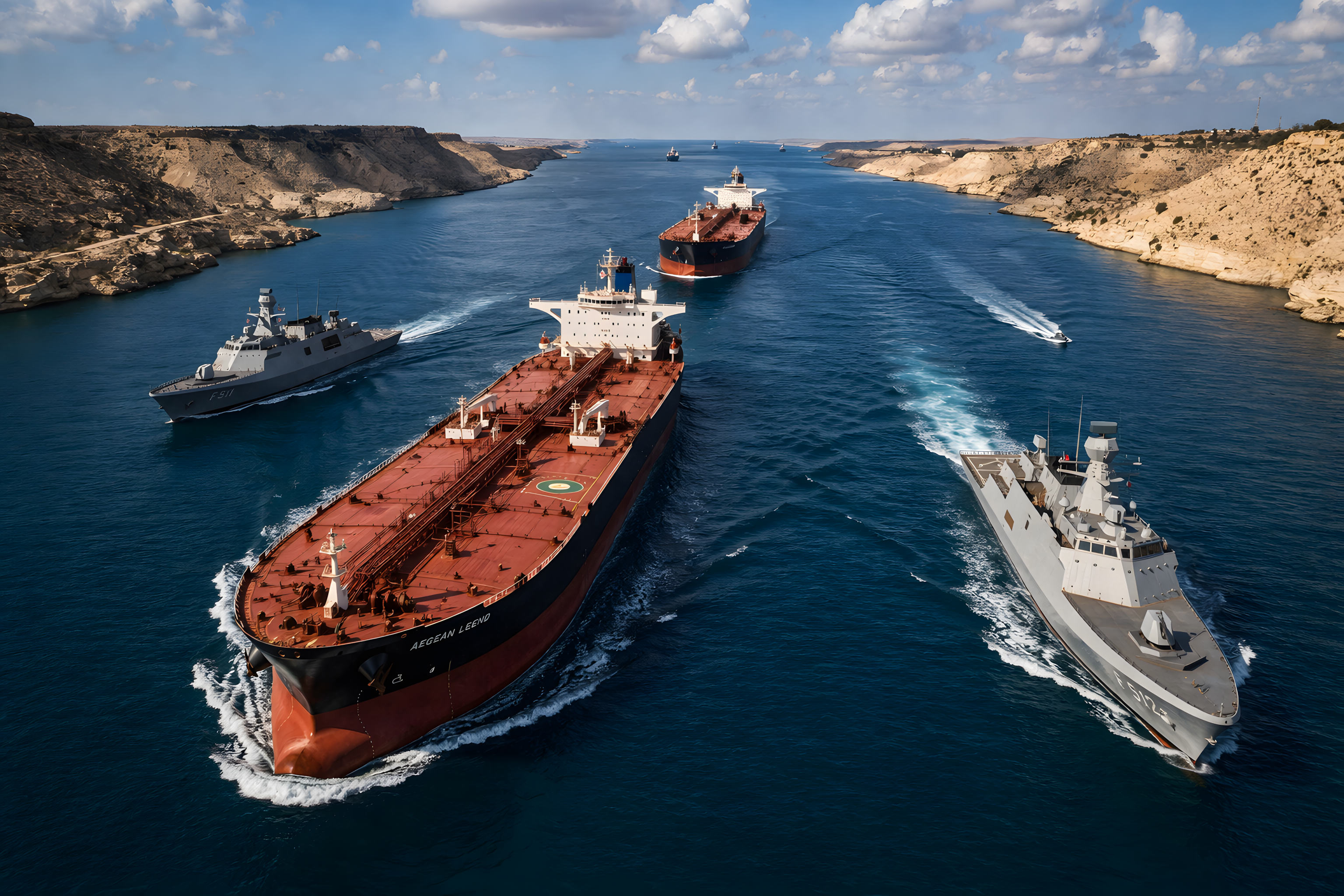 Das Foto zeigt eine beeindruckende Szene im Suezkanal, einer der wichtigsten Handelsrouten der Welt. Zu sehen sind mehrere Frachtschiffe und Kriegsschiffe, die sich durch den blauen Kanal zwischen der ägyptischen Wüstenküste hindurchschlängeln. Die hohe Perspektive aus der Luft ermöglicht einen umfassenden Blick auf die Schiffe und die umliegende Landschaft mit ihren charakteristischen Klippen und dem wolkenverhangenen Himmel.