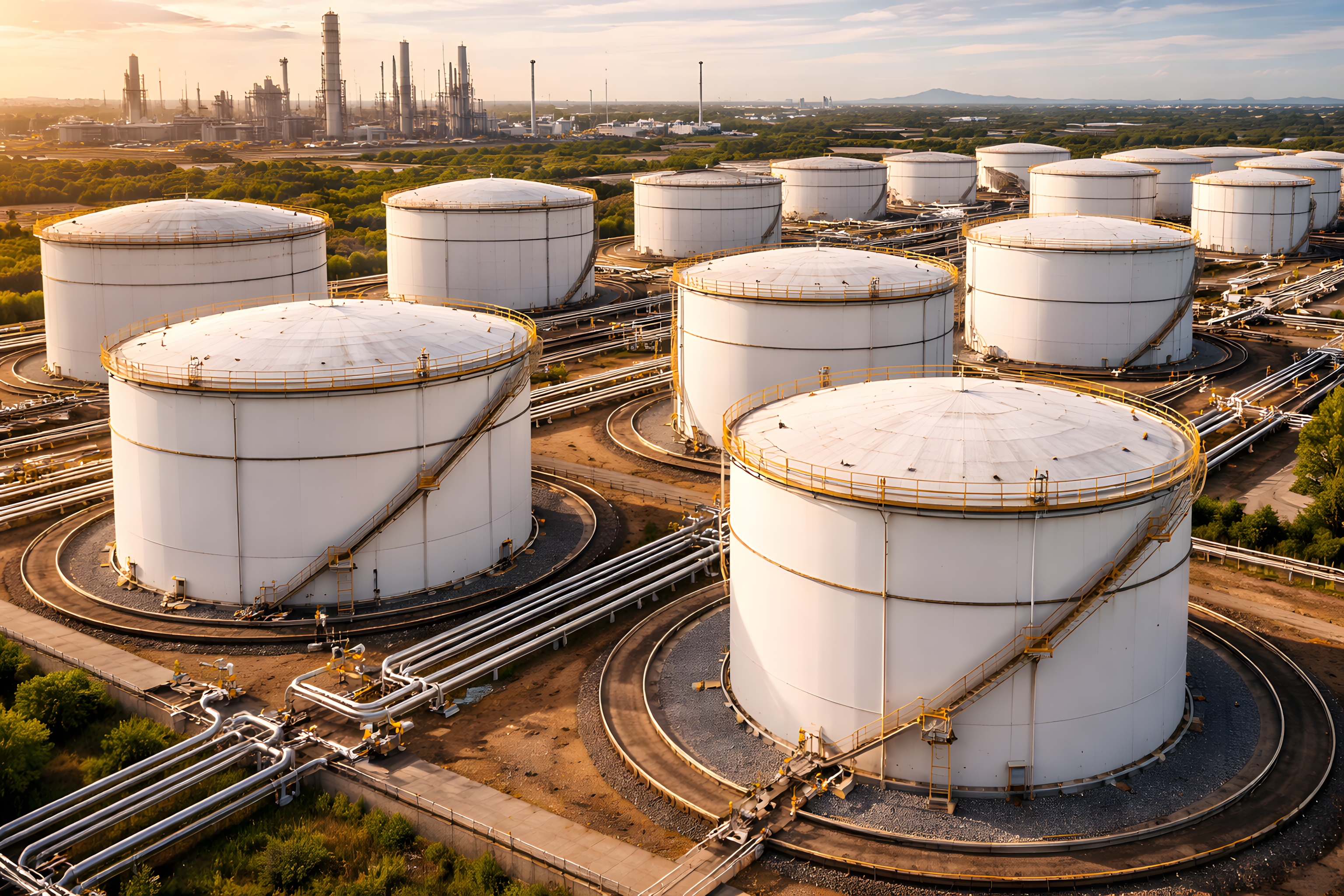 Das Foto zeigt eine beeindruckende Erdölraffinerie, die sich bei Sonnenaufgang in einem warmen Morgenlicht präsentiert. Dutzende riesiger, weißer Öltanks sind in einem geometrischen Layout über das Gelände verteilt, verbunden durch ein Netz an Pipelines und Transportwegen. Im Hintergrund ragen Fabrikgebäude und Industrieschornsteine in den Himmel, was den industriellen Charakter der Szene unterstreicht.