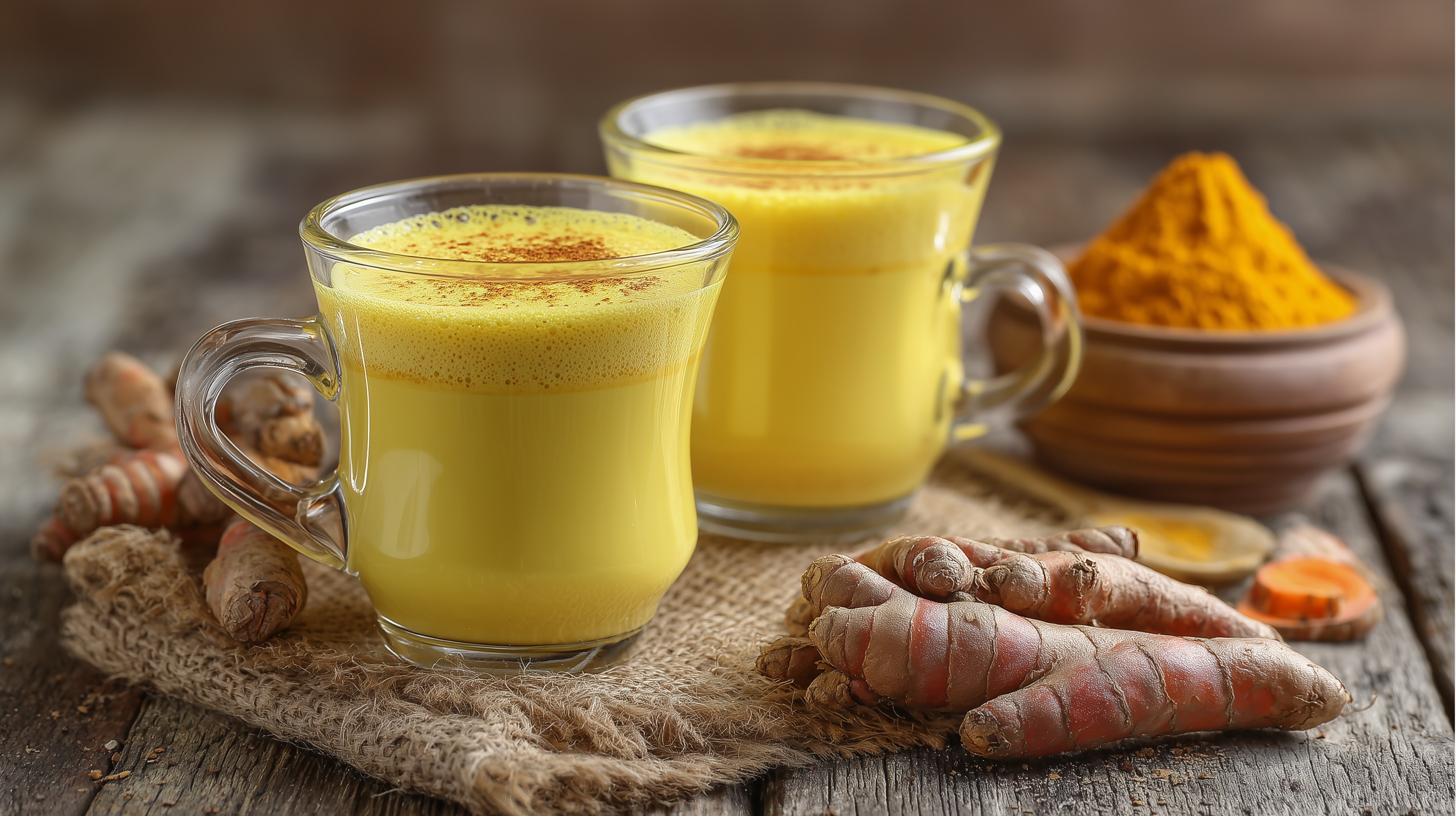 Das Bild zeigt einen aromatischen Kurkuma-Latte in zwei Gläsern. Der goldgelbe Farbton des Getränks kommt durch die Verwendung von Kurkuma zustande, einer Gewürzwurzel mit entzündungshemmenden und antioxidativen Eigenschaften. Neben Kurkuma sind auch Ingwer und andere Gewürze wie Zimt oder Kardamom in der Zubereitung enthalten, was dem Getränk einen würzig-milden Geschmack verleiht.