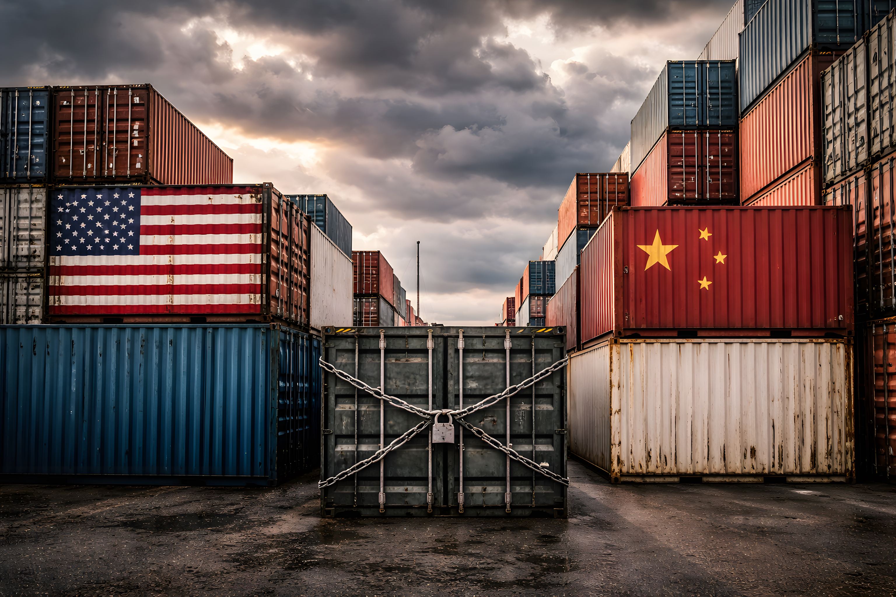 Das Foto zeigt eine dramatische Szene aus der globalen Handelswelt. Im Vordergrund sind mehrere Frachtcontainer mit den Nationalflaggen der USA und Chinas zu sehen, die offenbar einen Handelkonflikt zwischen den beiden Supermächten symbolisieren. Die düsteren Wolken am Himmel verstärken den Eindruck von Anspannung und Krise.