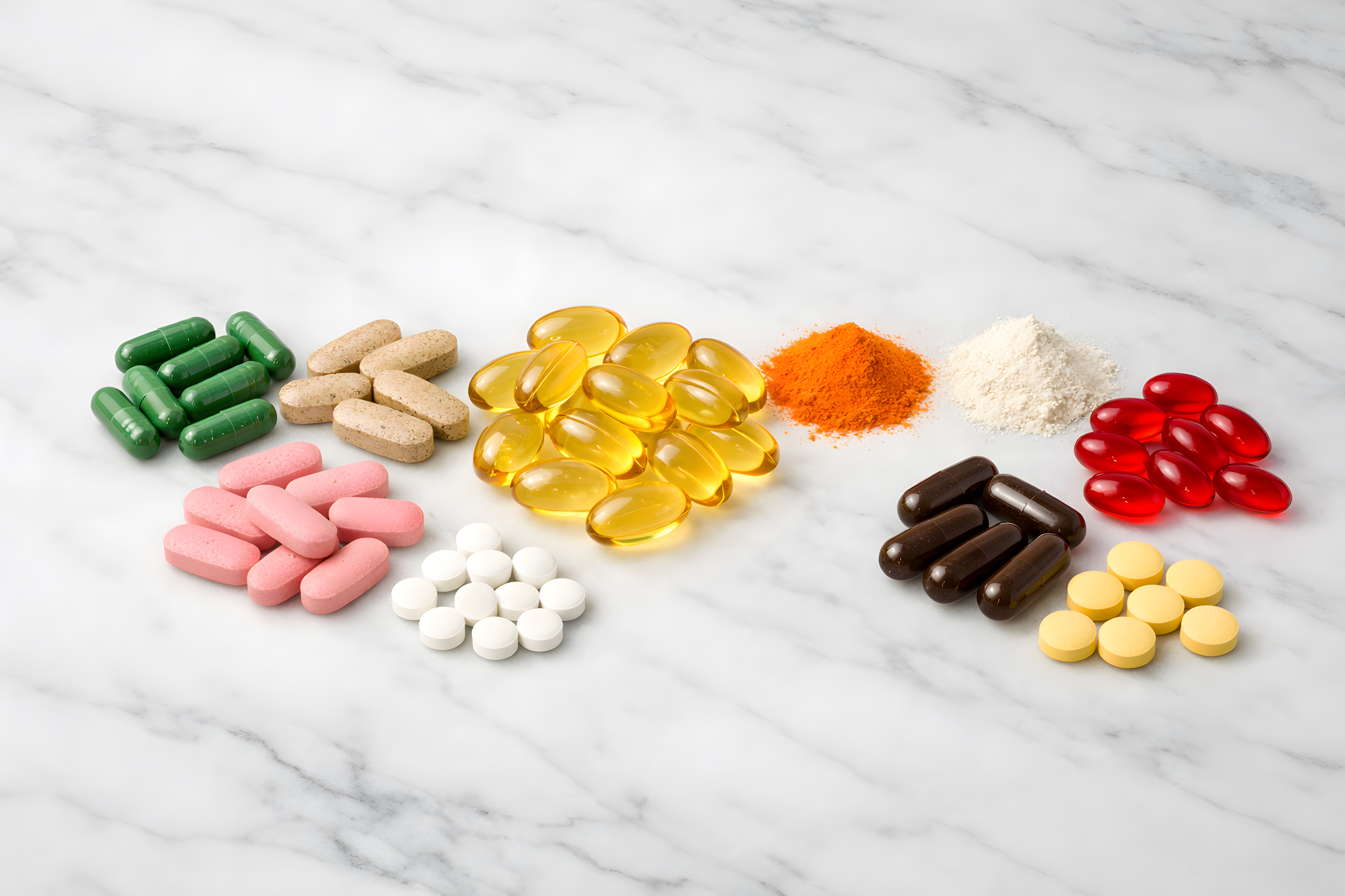 Das Foto zeigt eine Vielzahl von Nahrungsergänzungsmitteln und Medikamenten auf einer eleganten Marmoroberfläche. Unterschiedliche Kapseln, Tabletten und Pulver in verschiedenen Farben wie Grün, Rosa, Orange und Gelb sind sorgfältig angeordnet, was eine ansprechende Komposition ergibt. Die Perspektive und Beleuchtung verleihen dem Bild eine professionelle, hochwertige Ästhetik. Dieses Foto eignet sich hervorragend für den Einsatz in Präsentationen, Blogbeiträgen, Werbekampagnen oder Newslettern zum Thema Gesundheit, Wellness und Lifestyle. Es kann verwendet werden, um Produkte zu zeigen, Konzepte zu visualisieren oder Layouts für Printmedien und digitale Kanäle zu gestalten.