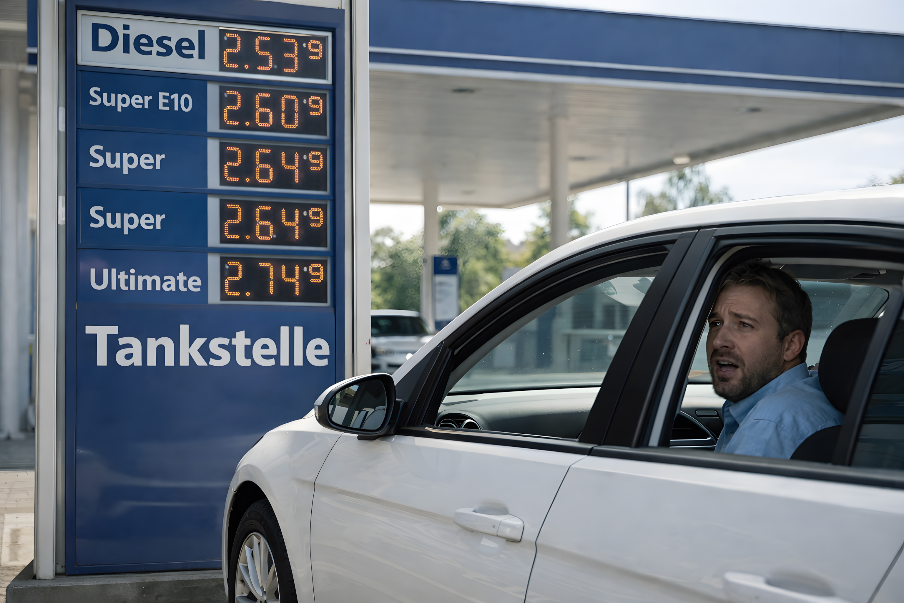 Das Foto zeigt eine Tankstellenanzeige, die aktuelle Kraftstoffpreise für Diesel, Super E10 und Ultimate anzeigt. Der Mann im Fahrzeug scheint die Preise zu überprüfen, bevor er tankt. Die großen digitalen Anzeigen machen die Preise für Autofahrer leicht ersichtlich. Diese Szene ist typisch für Tankstellen in vielen Regionen und kann für verschiedene Anwendungen wie Blogs, Social-Media-Beiträge, Präsentationen oder Werbenewsletter zur Veranschaulichung von Kraftstoffpreisen genutzt werden. Die Fokussierung auf die Preistafeln und den Autofahrer unterstreicht die Bedeutung von Mobilität, Kosten und Energieverbrauch im modernen Verkehrssystem.