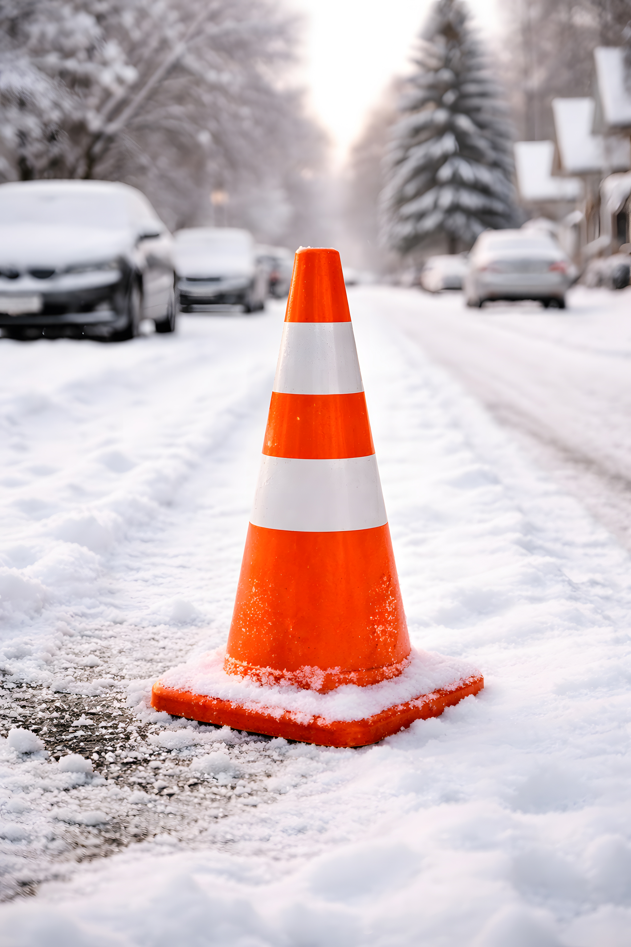 Das Bild zeigt einen orangefarbenen Verkehrskegel, der in einer verschneiten Winterlandschaft steht. Der Kegel hebt sich kontrastreich vom weißen Schnee ab und fungiert als Warnsignal für Autofahrer. Im Hintergrund sind verschwommene Umrisse von Tannen und anderen Bäumen zu erkennen, was eine typische Winterstimmung vermittelt. Die Komposition lenkt den Blick direkt auf den Kegel, der die Hauptattraktion des Bildes bildet. Dieses Foto eignet sich hervorragend für den Einsatz in Blogbeiträgen, Präsentationen oder Newslettern zum Thema Winterwetter, Verkehrssicherheit oder Infrastruktur. Die klaren Farben, die scharfe Fokussierung und die stimmungsvolle Atmosphäre machen das Bild zu einem attraktiven visuellen Element für verschiedenste Anwendungen.