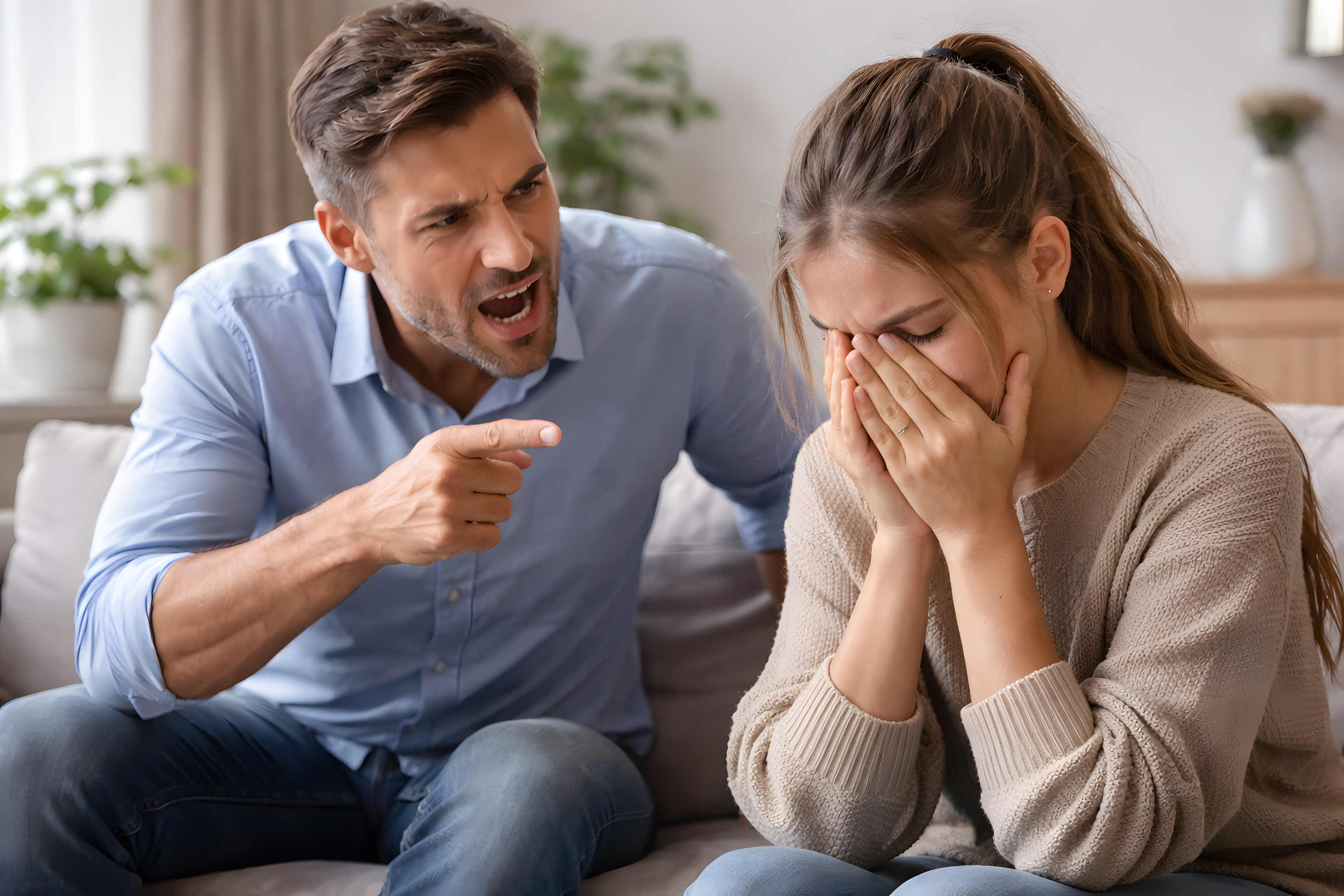 Das Foto zeigt ein junges Paar in einer emotionalen Auseinandersetzung. Die Frau verbirgt ihr Gesicht in ihren Händen, während der Mann mit wütendem Gesichtsausdruck auf sie einredet. Die Szene vermittelt Spannungen und Konflikte in einer Beziehung.