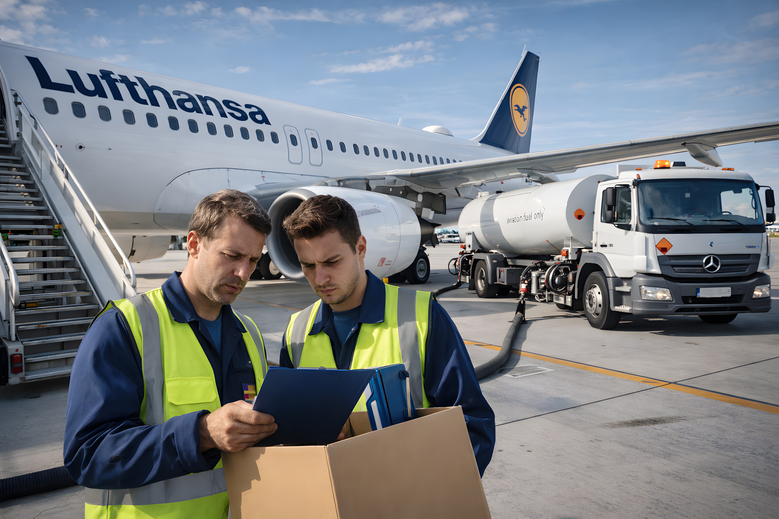 Das Bild zeigt zwei Mitarbeiter der Lufthansa, die sich auf dem Vorfeld eines Flughafens um die Vorbereitung eines Flugzeugs kümmern. Sie tragen gelbe Westen mit Reflektoren und scheinen Unterlagen oder Checklisten in der Hand zu halten, während sie das Flugzeug inspizieren. Im Hintergrund ist ein weiteres Lufthansa-Flugzeug sowie ein Tankfahrzeug zu sehen, die die geschäftige Atmosphäre eines Flughafens unterstreichen.