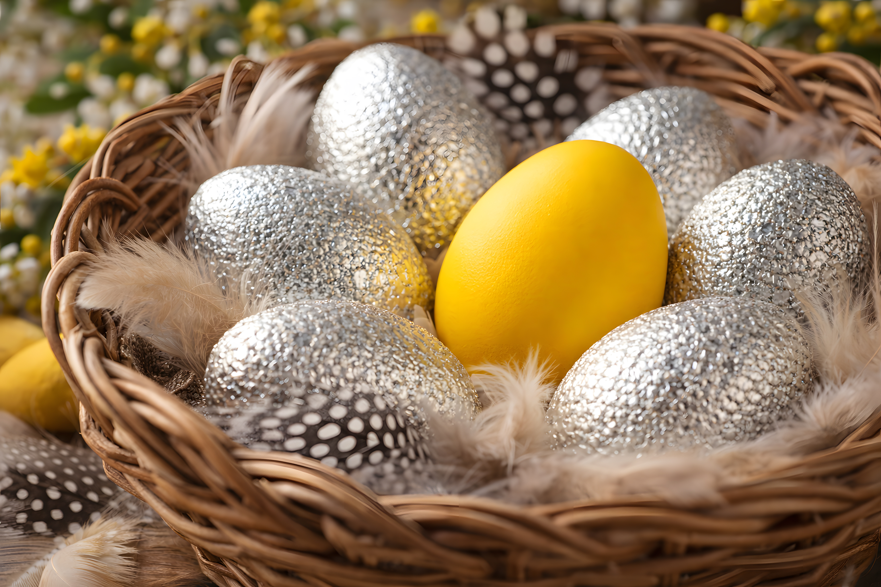 Dieses farbenfrohe Bild zeigt eine Nahaufnahme eines Osternests mit bunten Eiern in einem Korb. Die silbernen Ostereier sind mit Glitzer und Federn dekoriert, und ein leuchtend gelbes Ei sticht hervor. Das Nest befindet sich auf einer blühenden Frühlingswiese mit gelben Blumen im Hintergrund, was dem Motiv eine heitere, frische Note verleiht.
