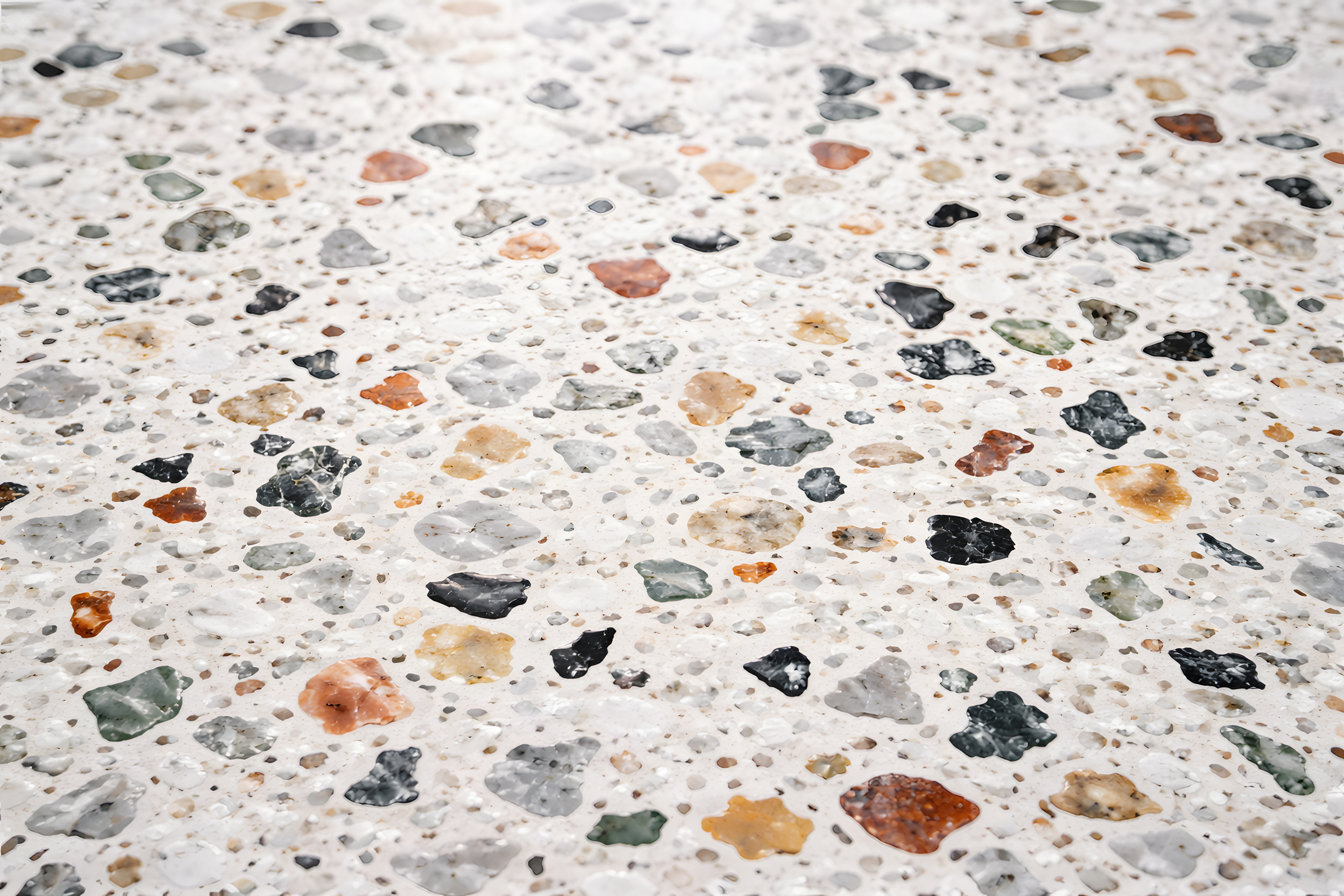 Dieses Foto zeigt eine detaillierte Aufnahme eines Terrazzo-Bodens. Terrazzo ist ein modernes Bodenmaterial, das aus einer Mischung aus Zement und eingebetteten, farbigen Steinen und Kieselsteinen besteht. Das Bild präsentiert eine bunte, abstrakte Textur mit verschiedenen Grau-, Rot- und Brauntönen, die ein interessantes, geometrisches Muster bilden. Die Perspektive ist nah und fokussiert, sodass die Struktur und Details des Materials klar erkennbar sind. Solch eine Terrazzo-Optik eignet sich perfekt als Hintergrund für Webseiten, Blogs, Präsentationen oder Social-Media-Beiträge, die eine moderne, zeitgemäße Ästhetik vermitteln möchten. Die farbenfrohe Gestaltung kann auch für die Gestaltung von Layouts, Grafikelementen oder Illustrationen verwendet werden.