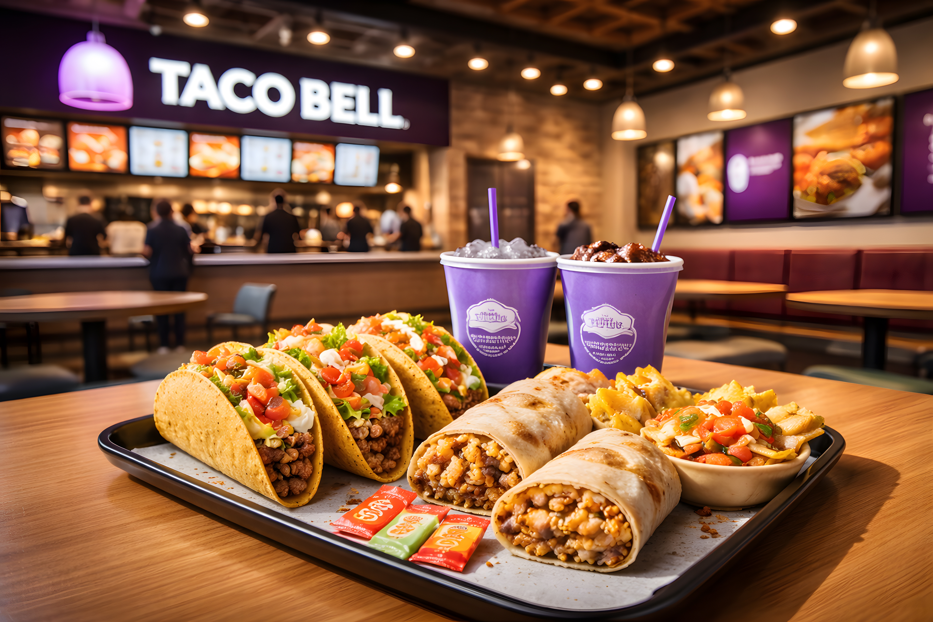 Das Foto zeigt eine Auswahl an leckeren Taco-Gerichten in einer Filiale der Fastfoodkette Taco Bell. Im Vordergrund sind mehrere gefüllte Tacos und Burritos zu sehen, die appetitlich angerichtet auf einem Serviertablett platziert sind. Dazu gibt es zwei Getränke in violett-farbenen Bechern. Der Hintergrund zeigt den modernen Gastraum der Filiale mit einer Steinwand, Holzvertäfelung und stimmungsvoller Beleuchtung. Das Taco-Bell-Logo sowie einladende Menü-Displays an der Theke runden das Bild ab. Das Foto eignet sich hervorragend für den Einsatz in Werbe- und Marketingmaterialien von Restaurants, Gastronomiebetrieben oder Lebensmittelherstellern, aber auch für Blogs, Social-Media-Kanäle oder Newsletter zum Thema Kulinarik.