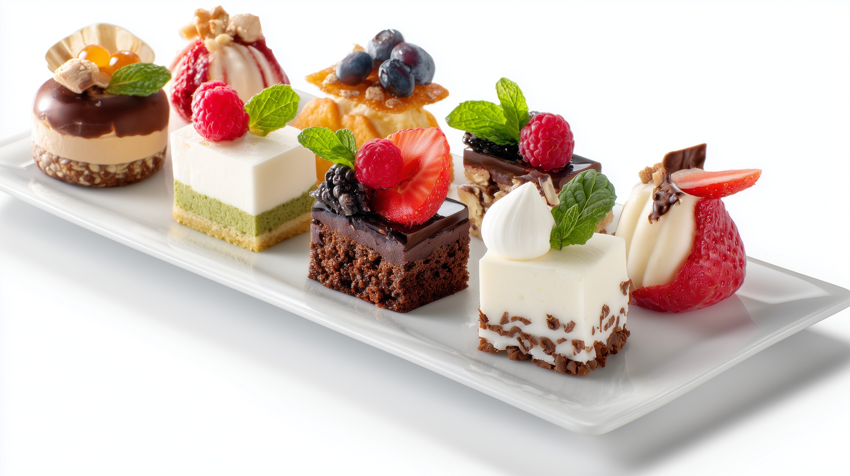 Die Desserts sind in unterschiedlichen Formen und Größen präsentiert, was für eine ansprechende Abwechslung und Vielfalt sorgt. Die Glasur, Creme und Früchte bilden eine farbenfrohe Komposition in Rot-, Violett- und Grüntönen. Durch die Nahaufnahme werden die Details und Texturen der Leckereien besonders betont, was den Betrachter direkt zum Genießen einlädt.