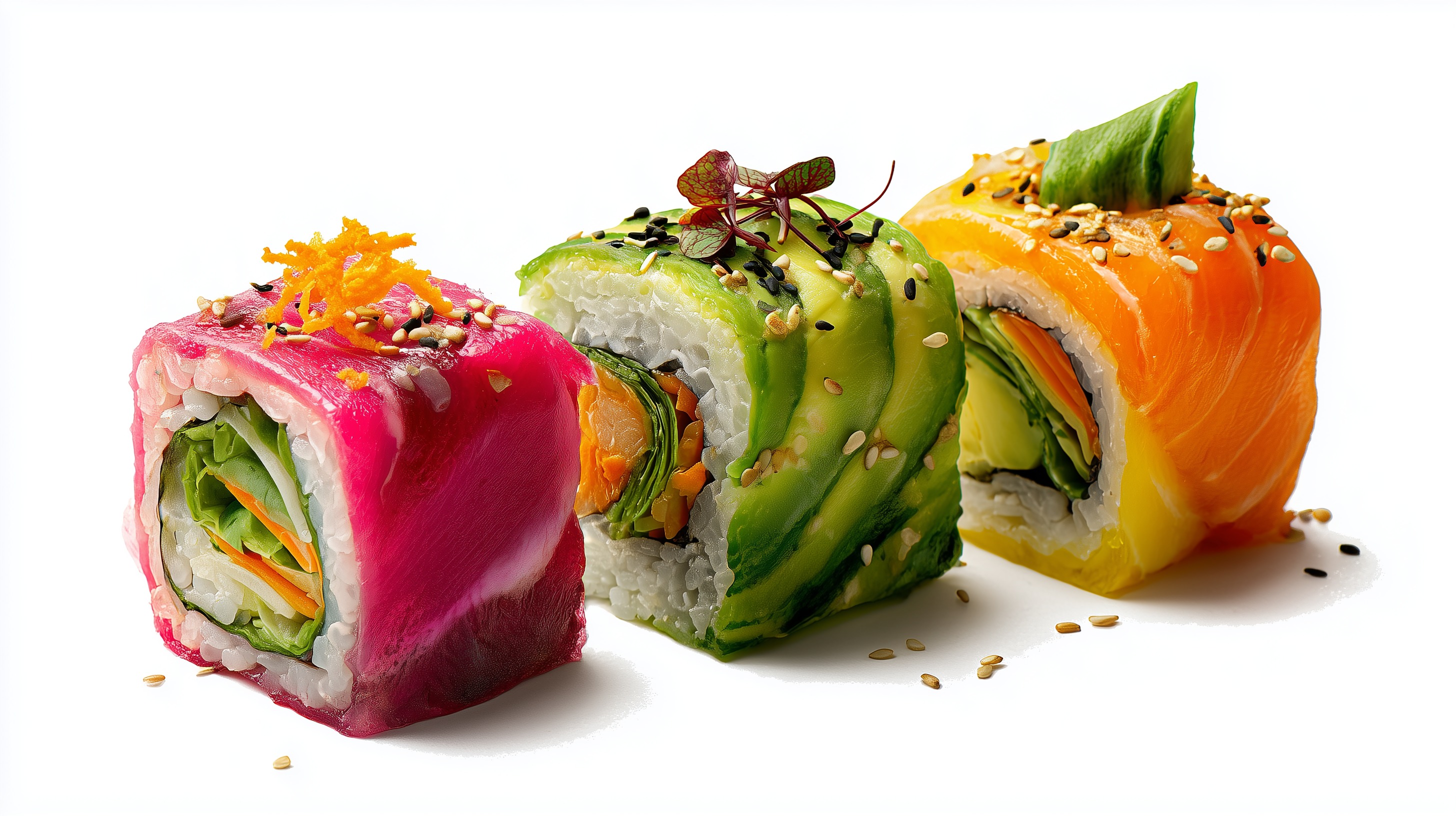 Das Foto zeigt eine bunte Sushi-Rolle, die sich perfekt für eine gesunde und abwechslungsreiche Ernährung eignet. Die Rolle ist aus Reis, Avocado, Karotte, Paprika und Sesam zusammengesetzt und präsentiert sich in einem attraktiven Farbspiel aus Grün, Orange und Rosa. Die Zutaten sind liebevoll angeordnet und verleihen der Rolle eine dekorative Optik, die sie zu einem echten Blickfang macht. Sushi-Rollen wie diese sind nicht nur lecker, sondern auch sehr fotogen und eignen sich daher hervorragend für die Verwendung in Blogs, auf Social-Media-Kanälen oder für die Präsentation in Präsentationen und Newslettern. Mit ihren frischen Zutaten, der ausgewogenen Nährstoffzusammensetzung und dem hohen Geschmacksfaktor sind die Rollen zudem eine gesunde Alternative zu herkömmlichen Snacks. Das Foto zeigt die Sushi-Rolle in einer stilvollen Nahaufnahme, die ihre Einzelheiten und Texturen betont und so den Appetit auf mehr weckt.