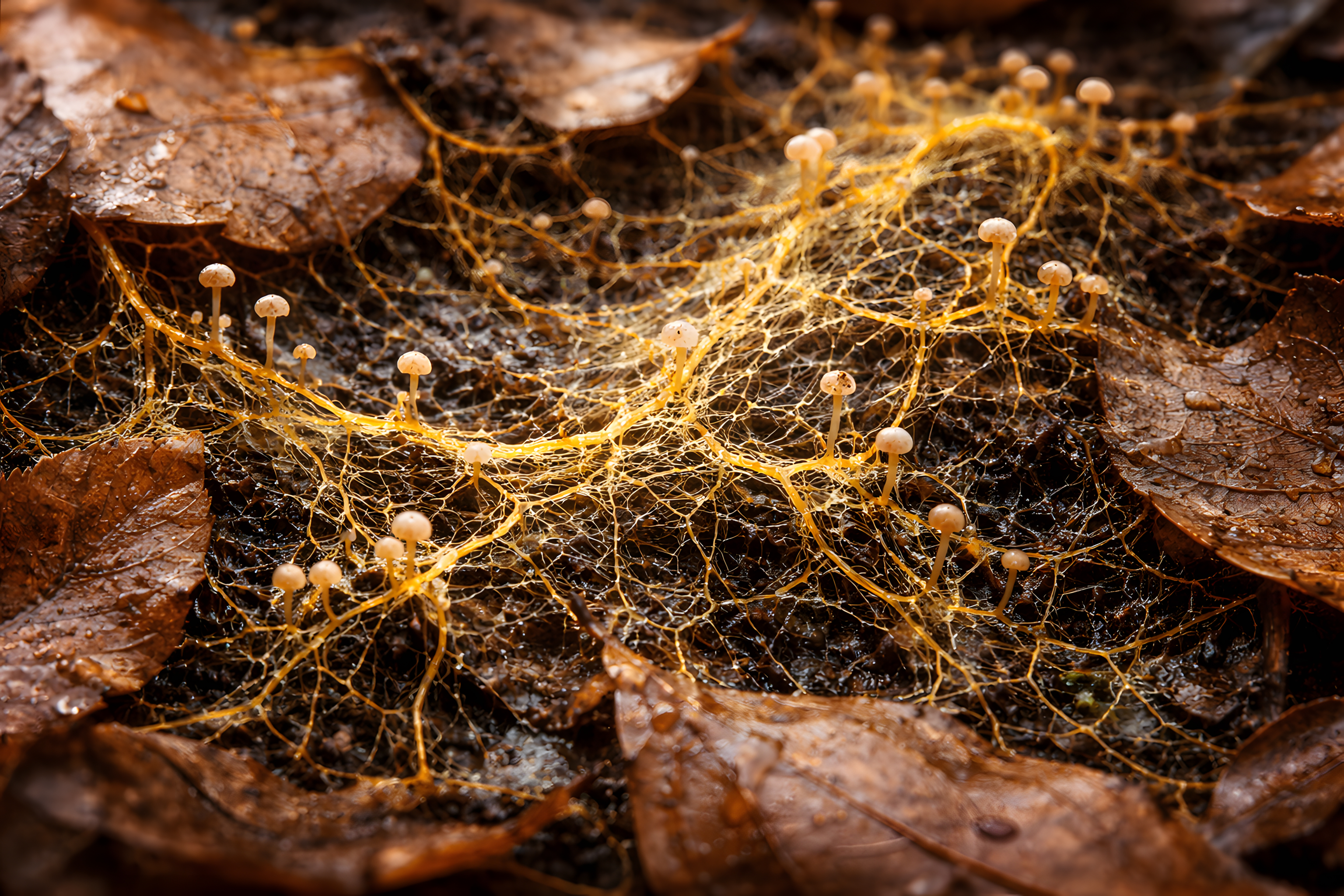 Dieses faszinierende Foto zeigt ein detailreiches Naturteppich, das aus einem dichten Geflecht von pilzartigen Strukturen und abgestorbenen Blättern besteht. In den warmen, erdigen Farbtönen von Braun, Orange und Dunkelgrün sind unzählige kleine, zarte Sporenköpfchen zu erkennen, die sich über die Oberfläche erstrecken. Die Komposition wirkt organisch und strukturiert zugleich, fast wie eine abstrakte Makroaufnahme. Dieses Bild lässt sich hervorragend als ästhetischer Hintergrund für Blogs, Social-Media-Posts, Präsentationen oder Newsletter einsetzen und verbreitet eine mystische, natürliche Stimmung. Mit seinen detaillierten Strukturen und Farben ist es auch ein interessantes Motiv für Naturliebhaber und Fotografen.