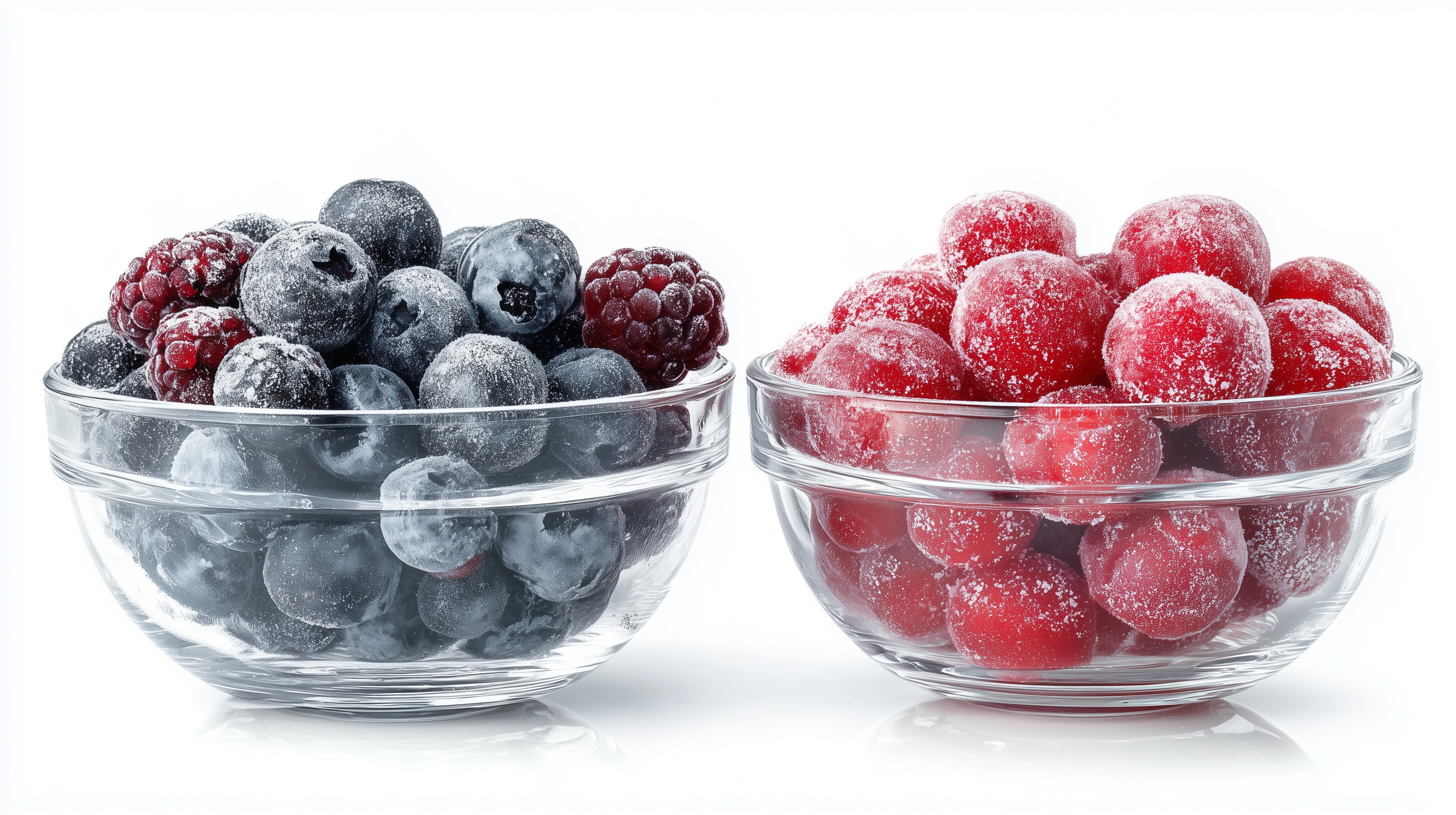 Dieses Foto zeigt zwei Glasschalen mit einer Auswahl an eingefrorenen Beeren. Links befinden sich dunkle Blaubeeren und Brombeeren, die mit einer feinen Eisschicht überzogen sind. Rechts sind die Schale mit leuchtend roten, zuckrig aussehenden Beeren gefüllt, vermutlich Preiselbeeren oder Cranberries.