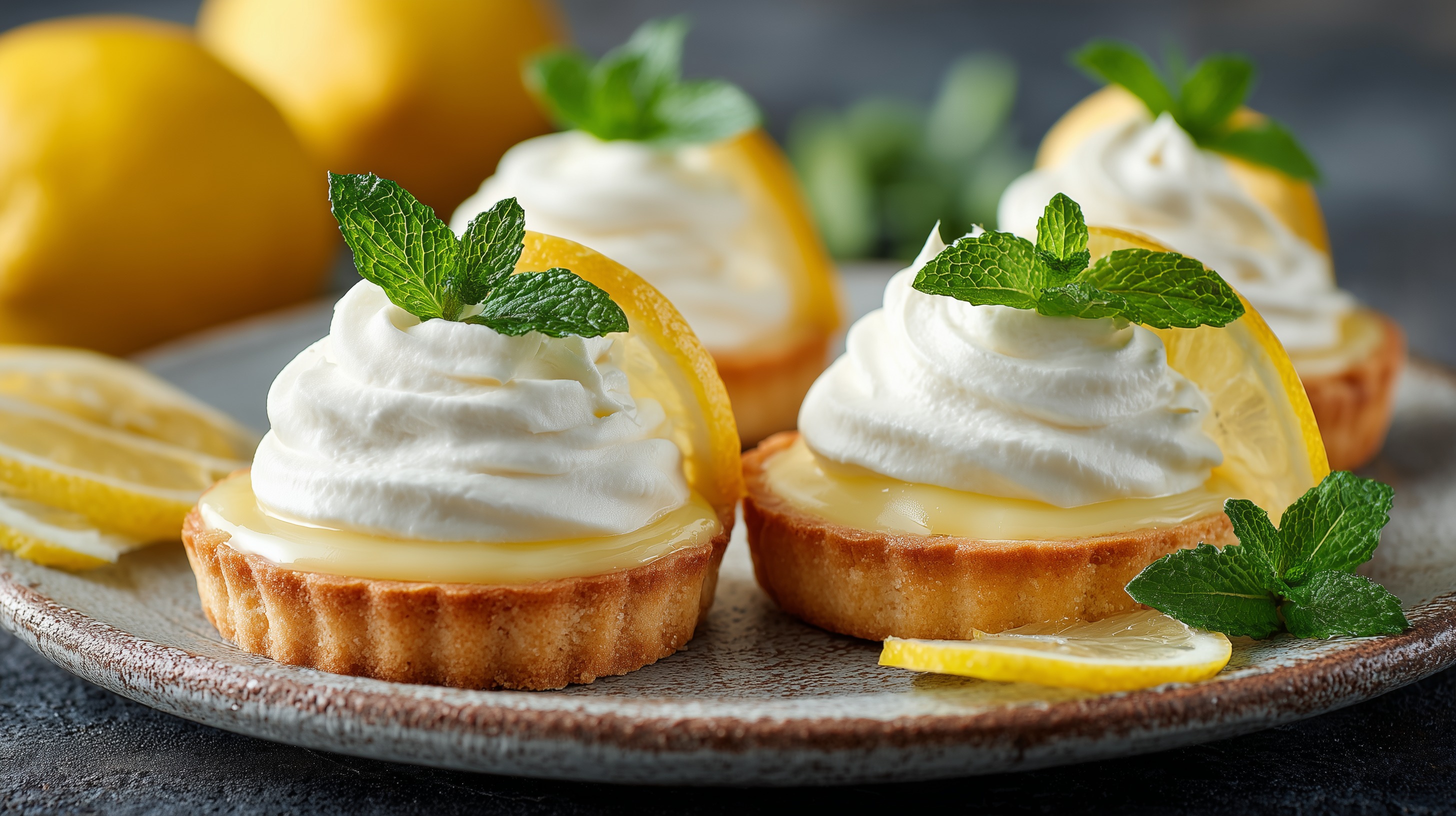 Diese leckeren Zitronentörtchen sind ein wahrer Genuss für Gaumen und Augen. Mit ihrer hellen, luftigen Sahnetopppung und dem frischen Zitronengeschmack sind sie der perfekte Snack für einen gemütlichen Feierabend oder ein Kaffeekränzchen. Das Foto zeigt die Törtchen auf einem dunklen Teller, dekoriert mit Zitronenscheiben und frischer Minze, was den sommerlich-erfrischenden Charakter betont. Die goldgelben Böden sind mit einer cremigen Zitronencrème gefüllt und verleihen dem Gebäck eine schöne Färbung. Die Törtchen können perfekt als Fingerfood für Partys, Hochzeiten oder andere Anlässe serviert werden oder auch als kleine Nascherei für zwischendurch. Das Rezept lässt sich leicht nachbacken und bietet eine gute Gelegenheit, seine Backfertigkeiten unter Beweis zu stellen. Egal ob für ein Fotoshooting, einen Blogbeitrag oder die eigene Social-Media-Präsenz - diese appetitanregenden Zitronentörtchen sind ein wahrer Hingucker!