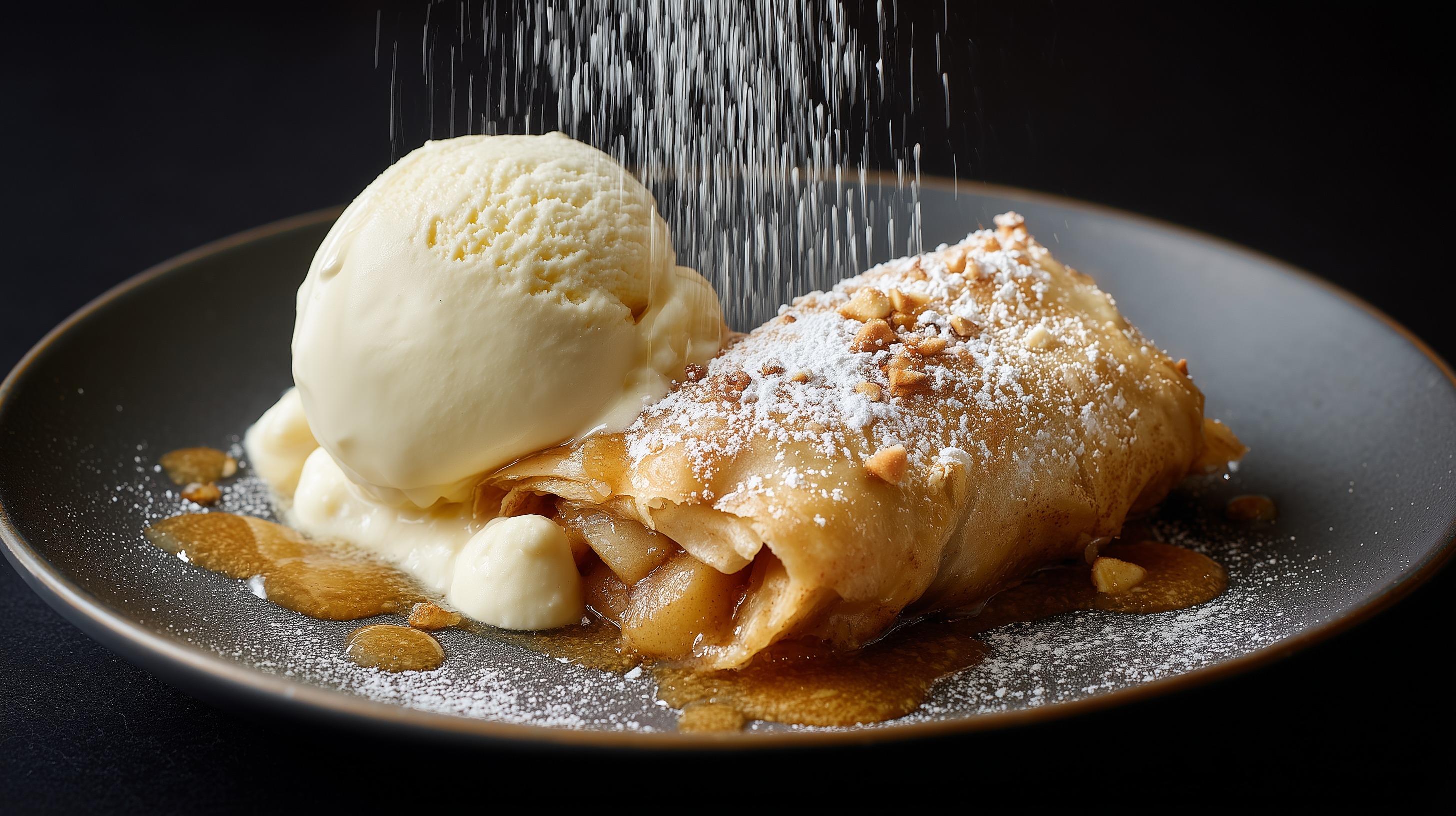 Dieses Foto zeigt ein köstliches Dessert, das aus einem Apfelstrudel und einer Kugel Vanilleeis besteht. Der Apfelstrudel ist goldbraun gebacken und mit Puderzucker bestreut, was ihm einen einladenden, verführerischen Anblick verleiht. Die Vanilleeiskugel, die neben dem Strudel platziert ist, sorgt für einen schönen Kontrast zwischen der warmen und der kalten Komponente.
