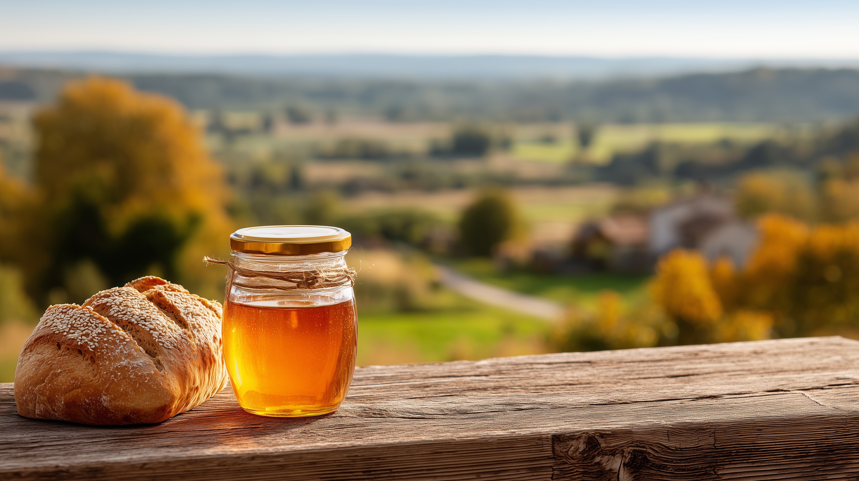 Das Foto zeigt eine Szenerie in einer wunderschönen Berglandschaft. Im Vordergrund steht ein Holztisch, auf dem ein Glas voller goldener Honig und ein frisch gebackenes Brot platziert sind. Im Hintergrund ist eine idyllische Landschaft mit Wiesen, Wäldern und Hügeln zu sehen, die im Herbstlaub in Gelb- und Orangetönen erstrahlen. Die Perspektive lässt den Betrachter förmlich in die Ruhe und Entspannung der Natur eintauchen. Dieses Bild eignet sich hervorragend für den Einsatz in Blogs, Social-Media-Beiträgen oder Präsentationen zum Thema Natur, Ernährung, Landwirtschaft oder auch Entspannung. Es vermittelt eine angenehme, ländliche Atmosphäre und lädt zum Verweilen ein.