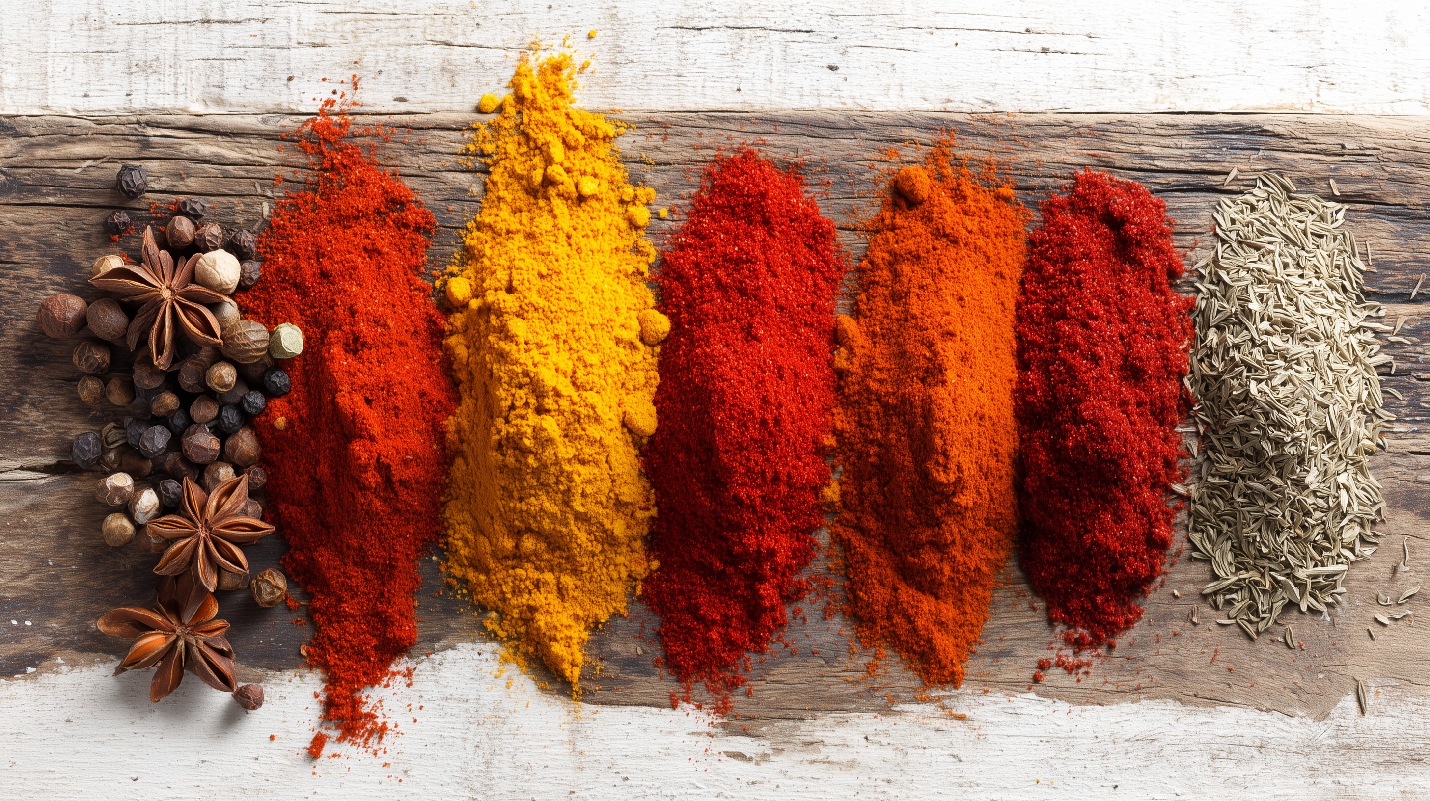 Das Foto präsentiert eine farbenfrohe Auswahl an verschiedenen aromatischen Gewürzen, die auf einem rustikalen Holztisch arrangiert sind. Die Gewürze in leuchtenden Rottönen sowie gelblichen und orangefarbenen Nuancen bilden eine stimmungsvolle Farbpalette. Die Perspektive lässt den Betrachter einen Blick auf die Textur und Maserung des Holzes werfen, was der Szene eine natürliche, ländliche Atmosphäre verleiht.