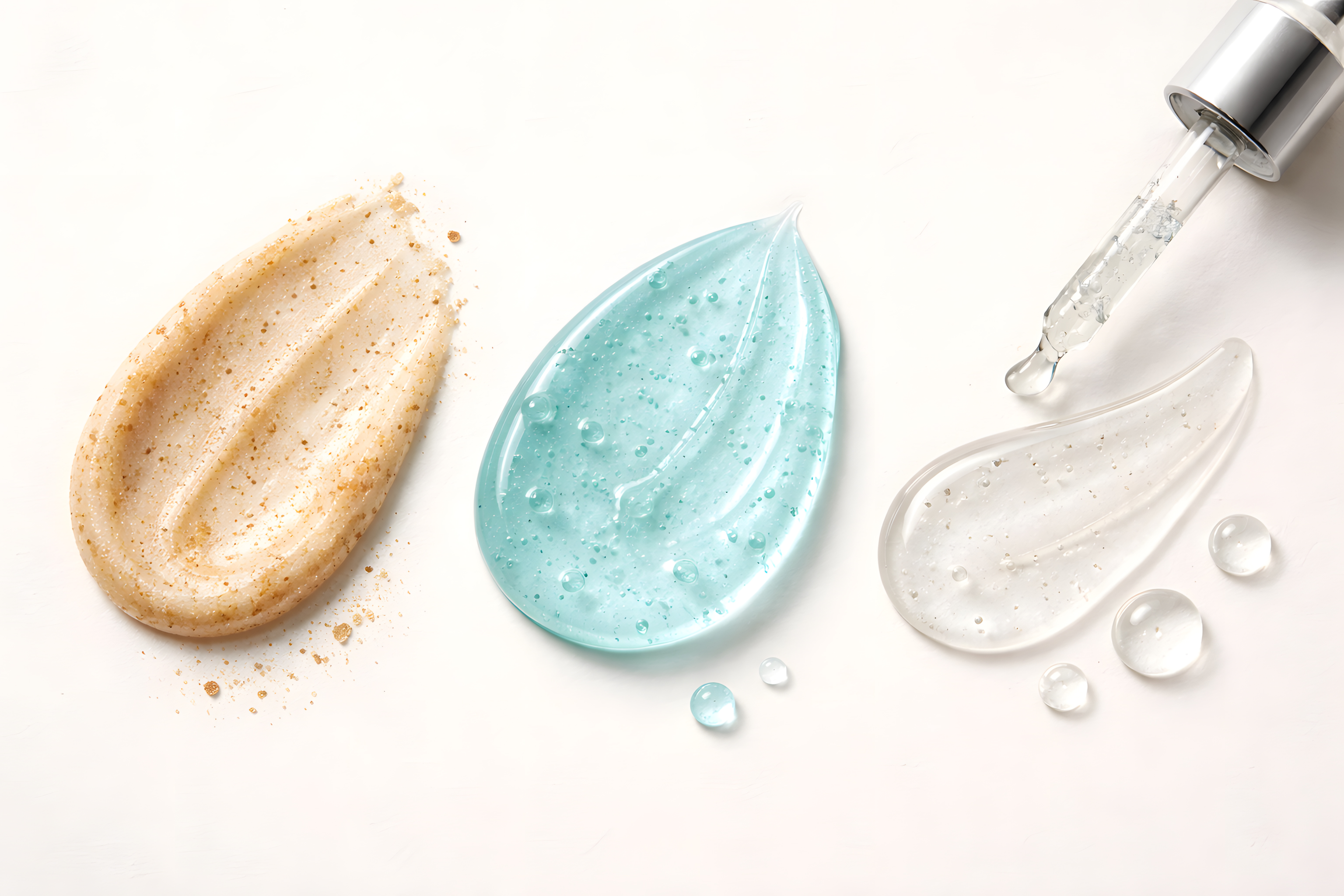 Auf dem Foto sehen wir eine Auswahl an Badezimmerprodukten auf einem weißen Hintergrund. Im Vordergrund befindet sich ein beiger, geriffelter Schwamm, der an eine Muschel erinnert. Daneben liegt eine hellblaue, runde Seife mit einem marmorisierten Muster. Im Hintergrund sehen wir eine transparente Glaskaraffe mit Wassertropfen. Insgesamt vermittelt die Anordnung der Produkte einen ästhetischen, minimalistischen Eindruck und passt gut zu einem Badezimmer-Thema oder einem Spa-Konzept. Diese Aufnahme eignet sich hervorragend für Blogs, Social-Media-Beiträge oder Präsentationen rund um Körperpflege, Wellness und Schönheit.
