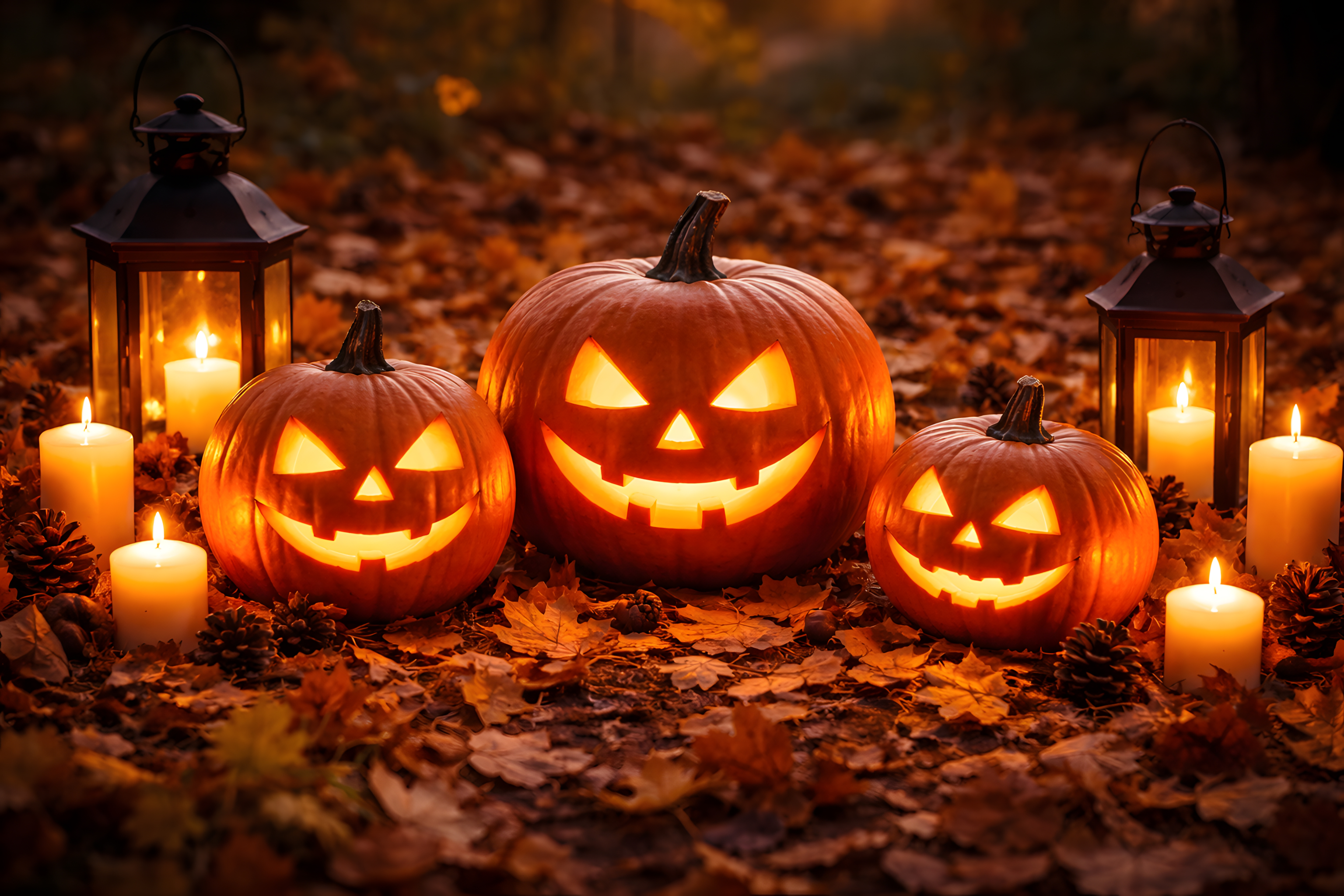 Auf dem Foto sind mehrere geschnitzte Kürbisse in einer herbstlichen Waldlandschaft zu sehen. Die Kürbisse sind mit Gesichtern versehen und leuchten im Inneren, offenbar durch Kerzen. Umgeben sind sie von Blättern, Tannenzapfen und weiteren Dekorationselementen wie Laternen. Die Szenerie ist in ein wärmendes, oranges Licht getaucht, was eine stimmungsvolle, fast mystische Atmosphäre schafft.