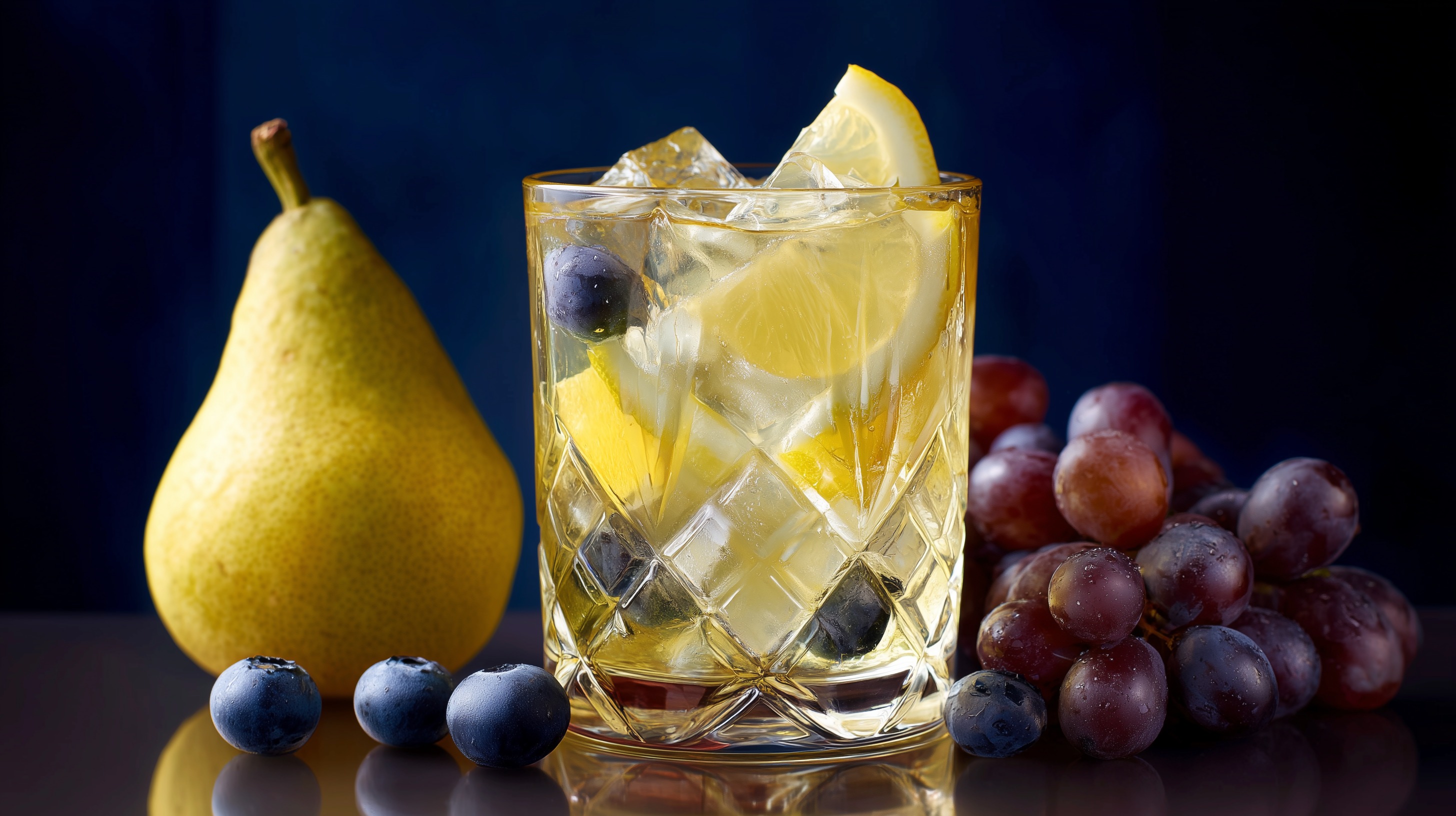Dieses Foto zeigt ein erfrischendes Getränk in einem kristallklaren Glas. Es ist mit Zitronenscheiben, Blaubeeren und Eiswürfeln garniert, die einen stimmungsvollen Kontrast zur dunklen Umgebung bilden. Die gelbe Farbe des Getränks und die Reflexionen im Glas verleihen dem Bild eine natürliche, appetitliche Ausstrahlung. Solch ein Getränk eignet sich perfekt als Aperitif oder erfrischender Cocktail an heißen Sommertagen und kann sowohl in Lifestyle-Blogs, Social-Media-Kanälen als auch in Präsentationen und Newslettern eingesetzt werden.