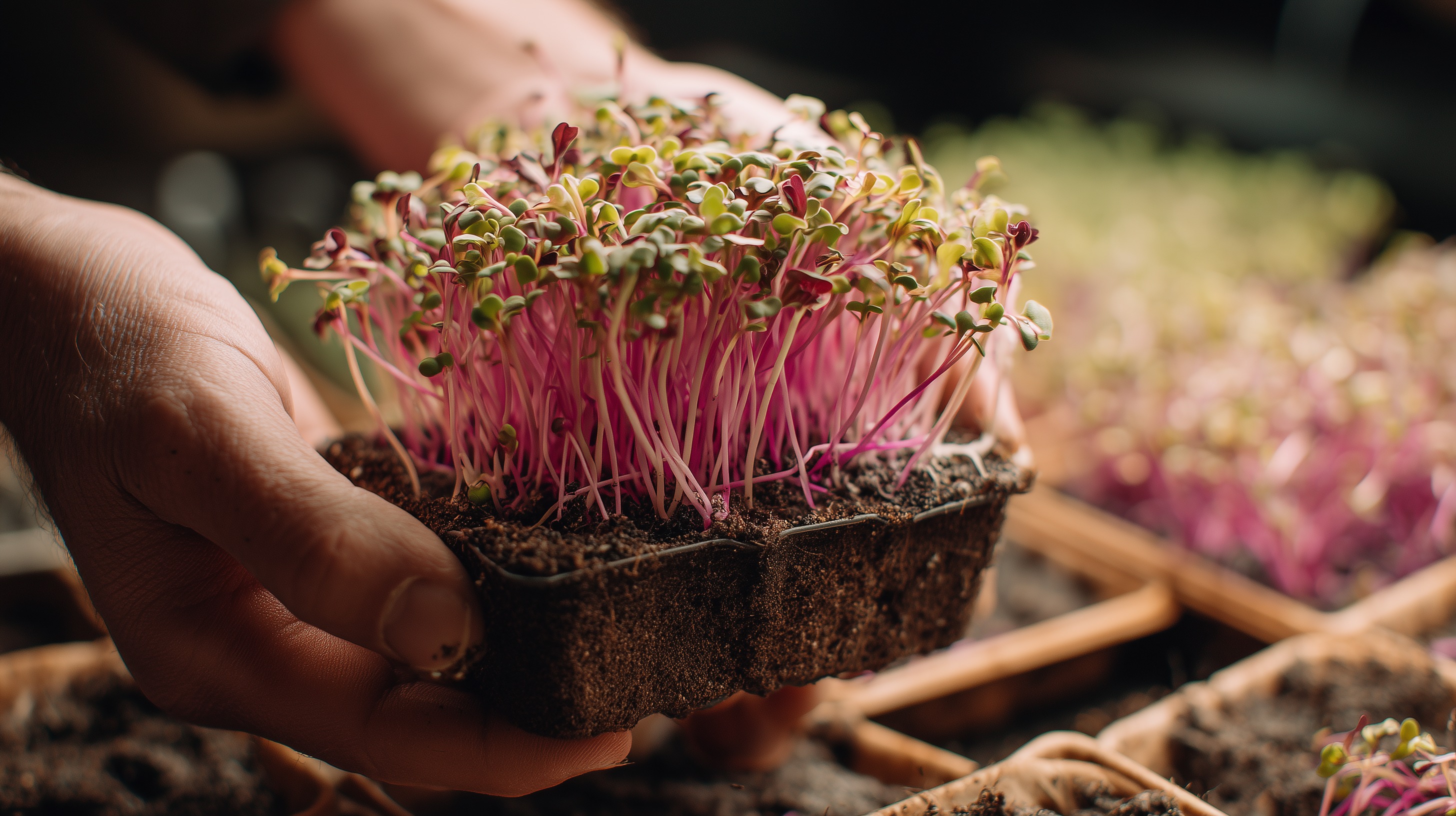 Auf dem Foto sind saftig grüne Mikrogrüns mit roten Spitzen zu sehen, die in einem Erde-Behälter wachsen. Die Pflanze scheint sich in einem frühen Wachstumsstadium zu befinden und ihre zarten Sprösslinge stehen eng und üppig beieinander. Die Perspektive ist nah und fokussiert, sodass die feinen Strukturen und Farben der Mikrogrüns deutlich zu erkennen sind. Mikrogrüns sind kleine, junge Keimlinge von verschiedenen Gemüse- und Kräuterarten, die als Superfood gelten und reich an Vitaminen, Mineralstoffen und Antioxidantien sind. Solche Mikrogrüns eignen sich hervorragend als gesunde Zutat in Salaten, Smoothies oder als Garnitur in der Gastronomie. Dieses stimmungsvolle Foto könnte daher perfekt in einem Ernährungs-Blog, auf Social-Media-Kanälen oder in einem Newsletter zum Thema Nachhaltigkeit, Urban Gardening oder gesunde Ernährung eingesetzt werden.