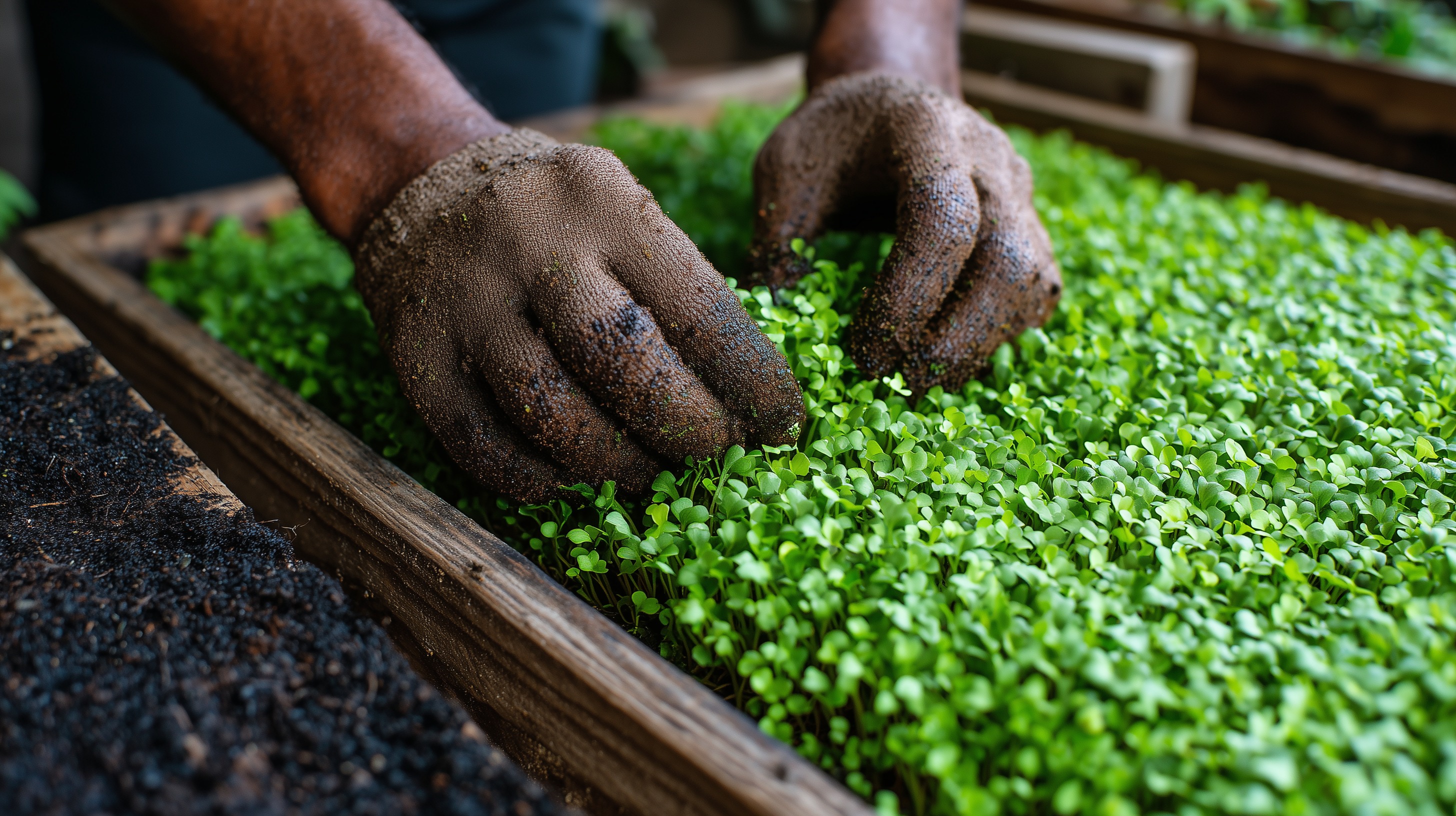 Das Bild zeigt die Hände eines Gärtners, wie sie zärtlich kleine Sprosse in der feuchten Erde einer Anzuchtschale platzieren. Der Fokus liegt auf dem detaillierten Kontakt zwischen den erdigen Händen und den noch zarten, grünen Blättern der keimenden Saat. Die kräftigen, aber geschickten Finger geben einen intimen Einblick in den Prozess des natürlichen Wachstums und der Pflanzenzucht. Dieses Foto könnte in Artikeln über Gartenarbeit, nachhaltige Landwirtschaft, Ökologie oder den Kreislauf der Natur verwendet werden. Es vermittelt Themen wie Erde, Saat, Keimung und den manuellen Anbau von Pflanzen auf eine visuelle, fast schon poetische Art und Weise.