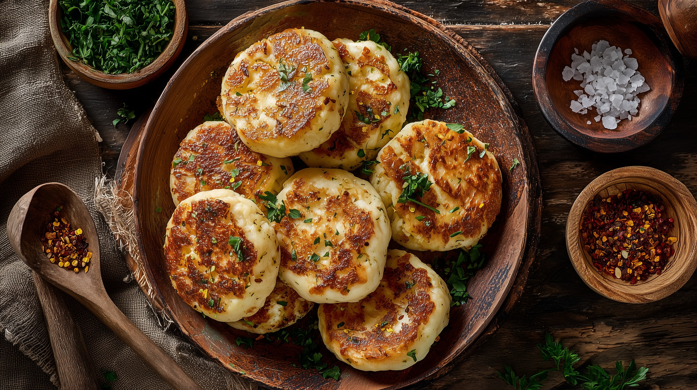 Dieses Foto zeigt eine Auswahl köstlicher, goldbraun gebackener Kartoffelküchlein auf einem rustikalen Holzteller. Die Küchlein sind mit frisch gehackter Petersilie bestreut und stehen vor einem dunklen, holzigen Hintergrund. Umgeben sind sie von weiteren Zutaten wie grünen Blättern, Gewürzen und Salz, die den natürlichen, herzhaften Charakter des Gerichts unterstreichen. Die appetitliche Anordnung der Kartoffelpuffer sowie die warmen Farbtöne und die raue Oberfläche des Holzes verleihen dem Bild eine stimmungsvolle, rustikale Atmosphäre. Solche Kartoffelgerichte eignen sich perfekt, um sie in Kochrezepten, Kochbüchern oder auf Foodblogs zu präsentieren. Auch für Social-Media-Posts, Präsentationen oder Newsletter wäre dieses Foto ein idealer Blickfang, der Appetit auf herzhafte, traditionelle Küche macht.