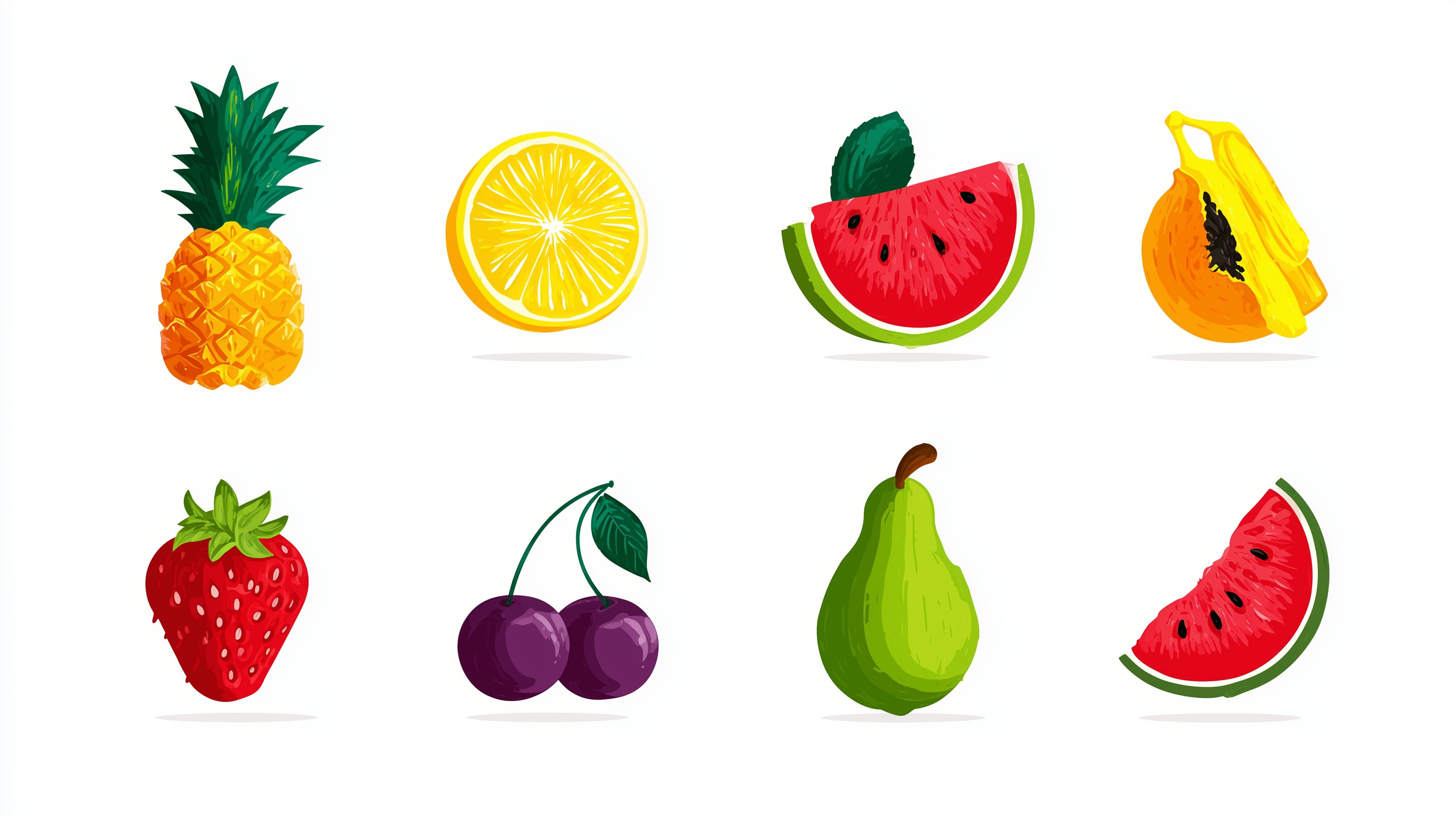 Diese Früchteillustrationen eignen sich hervorragend für die Gestaltung von Webseiten, Blogbeiträgen, Präsentationen oder Werbematerial im Bereich Ernährung, Gesundheit und Lebensmittel. Sie können sowohl einzeln als auch in Kombinationen eingesetzt werden, um Inhalte optisch aufzulockern und den Appetit auf frische, vitaminreiche Produkte anzuregen.
