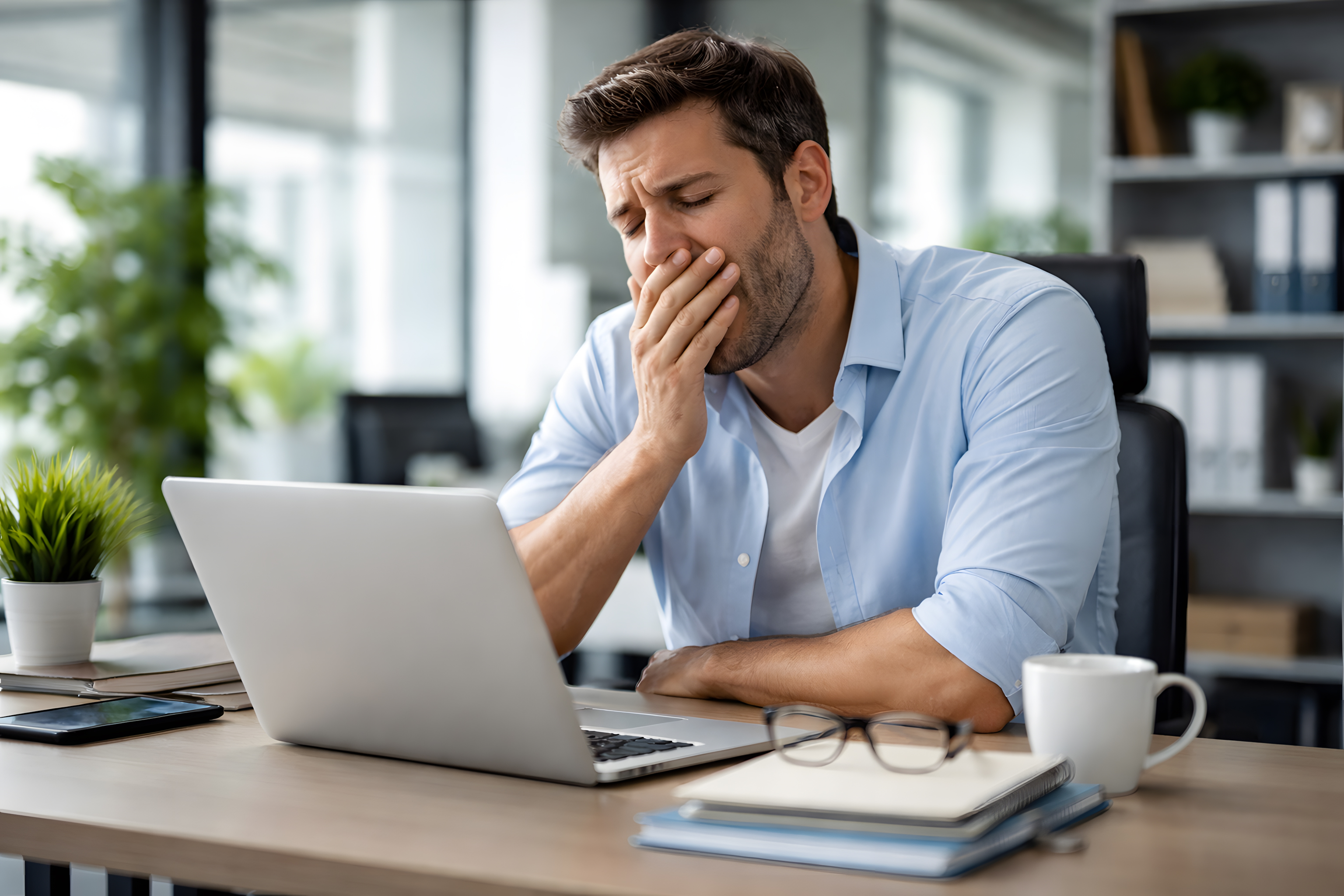 Auf dem Foto ist ein gestresster Mann zu sehen, der an seinem Laptop im Büro sitzt. Mit gesenktem Blick und der Hand vor dem Gesicht scheint er überfordert und frustriert zu sein. Die Körperhaltung und der Gesichtsausdruck deuten auf Müdigkeit, Erschöpfung und Konzentrationsschwierigkeiten hin.