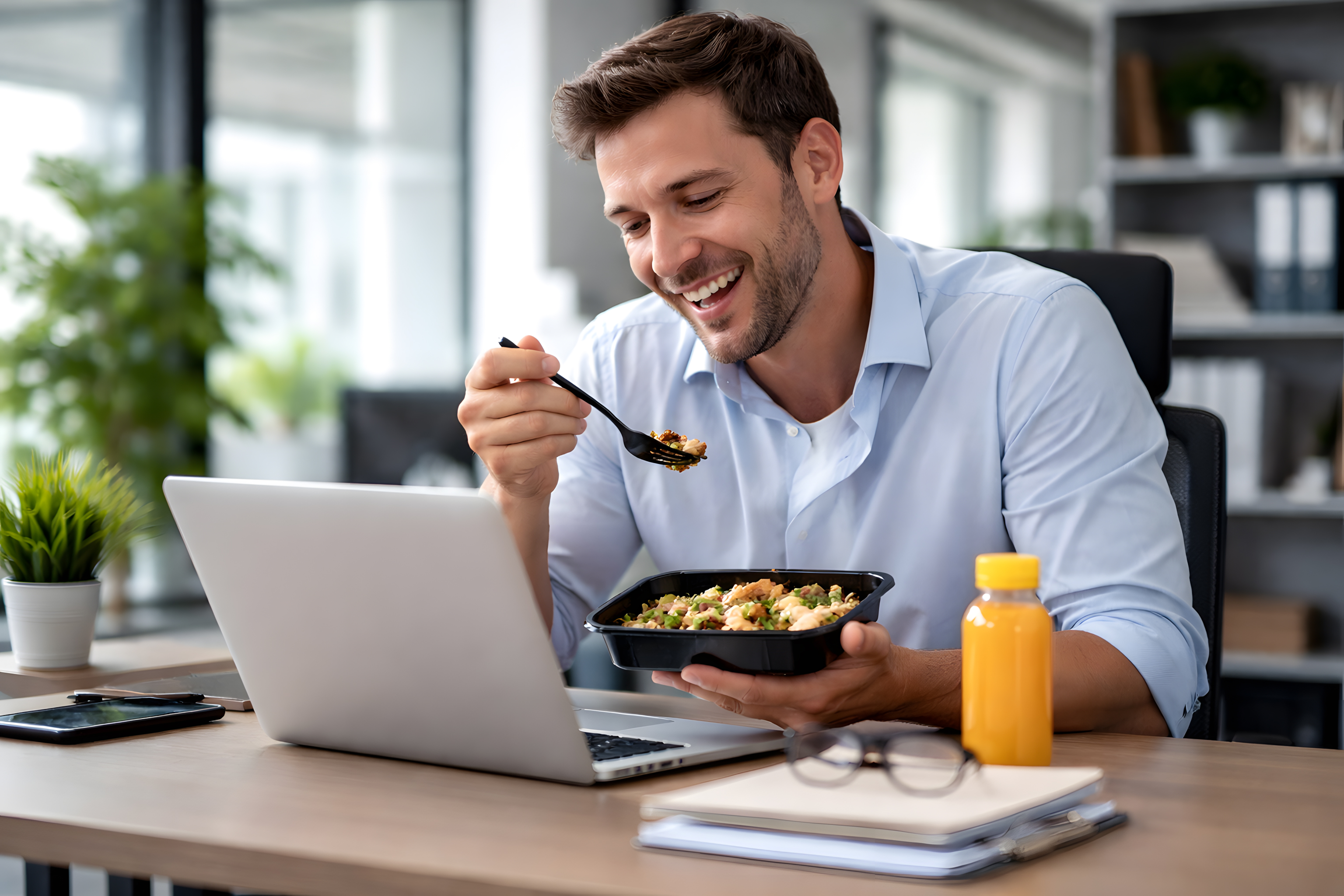 Diese Szene vermittelt, wie wichtig es ist, auch während der Arbeit auf die eigene Gesundheit und Ernährung zu achten. Eine ausgewogene Mittagspause kann die Produktivität steigern, Energie und Motivation freisetzen. Das Foto eignet sich hervorragend für Blogs, Social-Media-Kanäle oder Präsentationen rund um Themen wie Work-Life-Balance, Führungskultur oder gesunde Bürogewohnheiten.