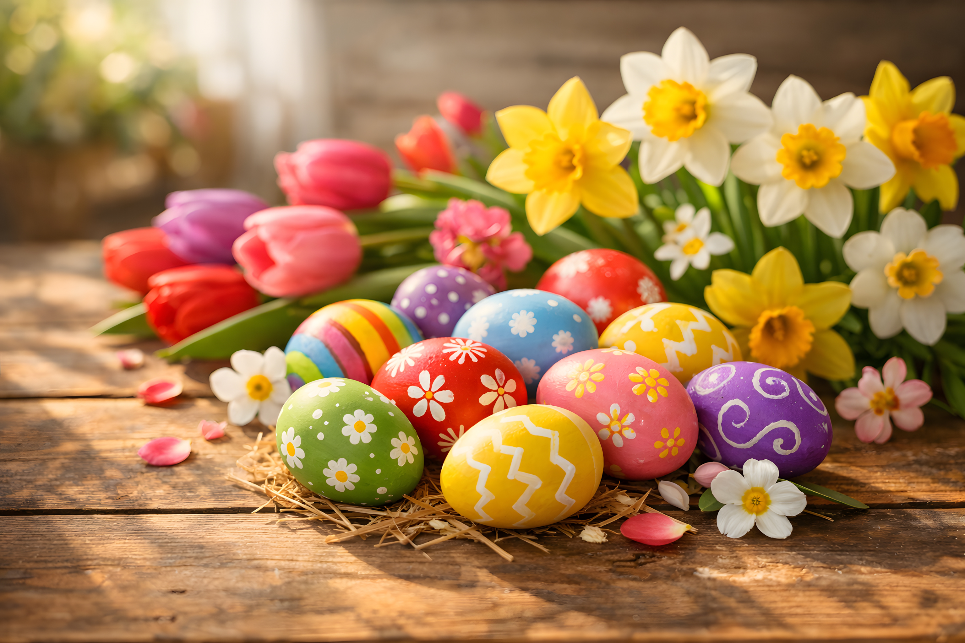 Dieses farbenfrohe Bild zeigt eine Vielzahl von Ostereier in verschiedenen Farben und Mustern, umgeben von wunderschönen Frühlingsblumen wie Tulpen und Narzissen. Die Eier sind liebevoll auf einem rustikalen, hölzernen Untergrund angeordnet, der einen natürlichen und stimmungsvollen Hintergrund bildet. Die kräftigen Farben und detaillierten Designs der Osterdekoration schaffen einen festlichen und fröhlichen Eindruck, der perfekt zur Osterzeit passt. Dieses Foto lässt sich hervorragend für Ostergrüße, Frühlings-Blogs, Social-Media-Postings oder Präsentationen zum Thema Ostern und Frühling verwenden.