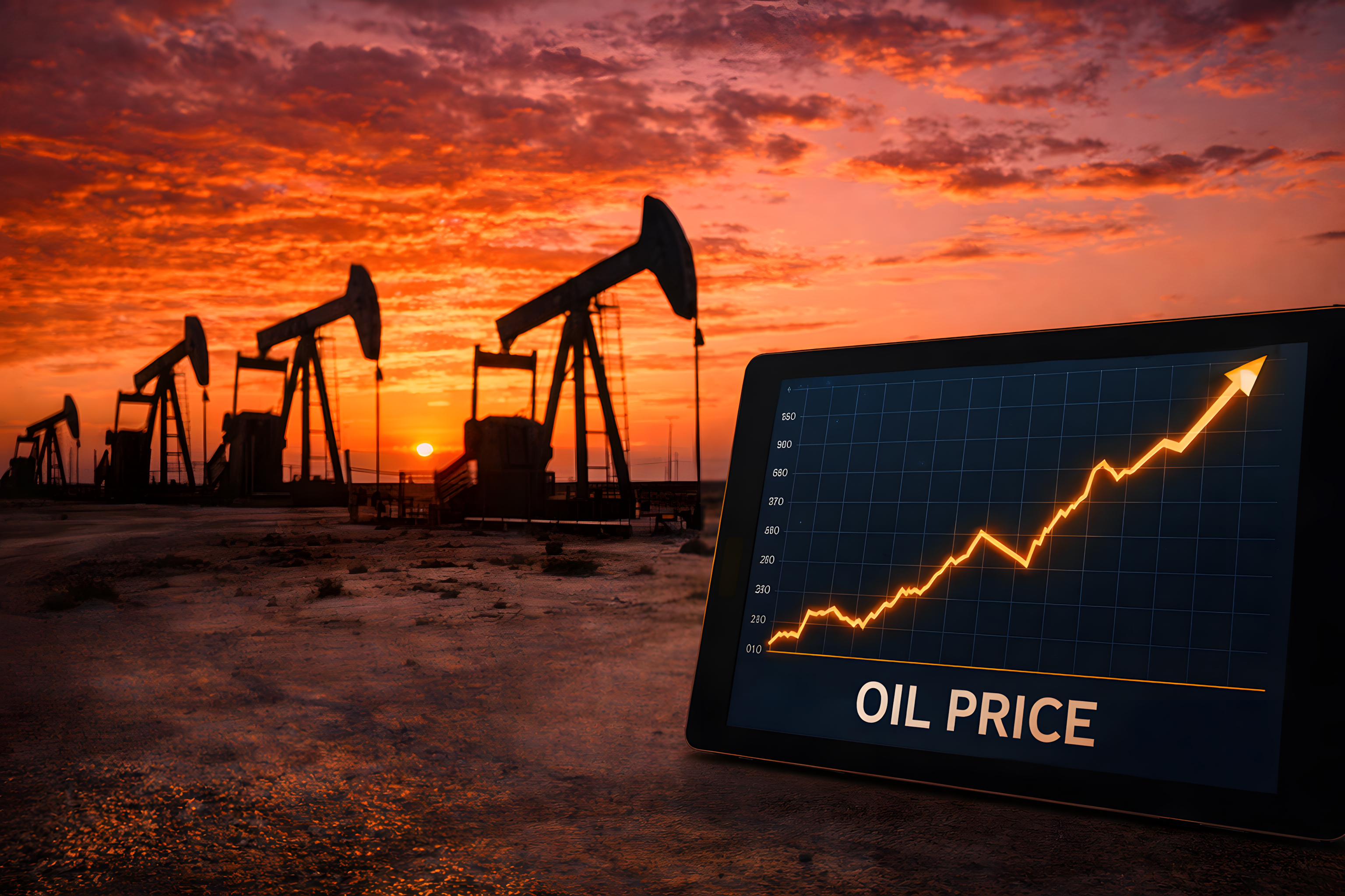 Dieses faszinierende Foto zeigt einen dramatischen Sonnenuntergang über einer Landschaft voller Ölpumpen. Der Himmel erstrahlt in einem intensiven, orangeroten Farbspiel, das sich in den Silhouetten der Förderanlagen widerspiegelt. Diese beeindruckende Szenerie visualisiert auf eindrucksvolle Art und Weise die Bedeutung der Ölindustrie und ihre zentrale Rolle in der globalen Energiewirtschaft. Das Bild eignet sich hervorragend für den Einsatz in Präsentationen, Blogbeiträgen oder sozialen Medien, wenn es um Themen wie Investitionen, Wirtschaftsentwicklung oder technologischen Fortschritt geht. Die dynamische Darstellung des Ölpreises im Vordergrund unterstreicht zudem die Volatilität und Relevanz dieses wichtigen Rohstoffs.