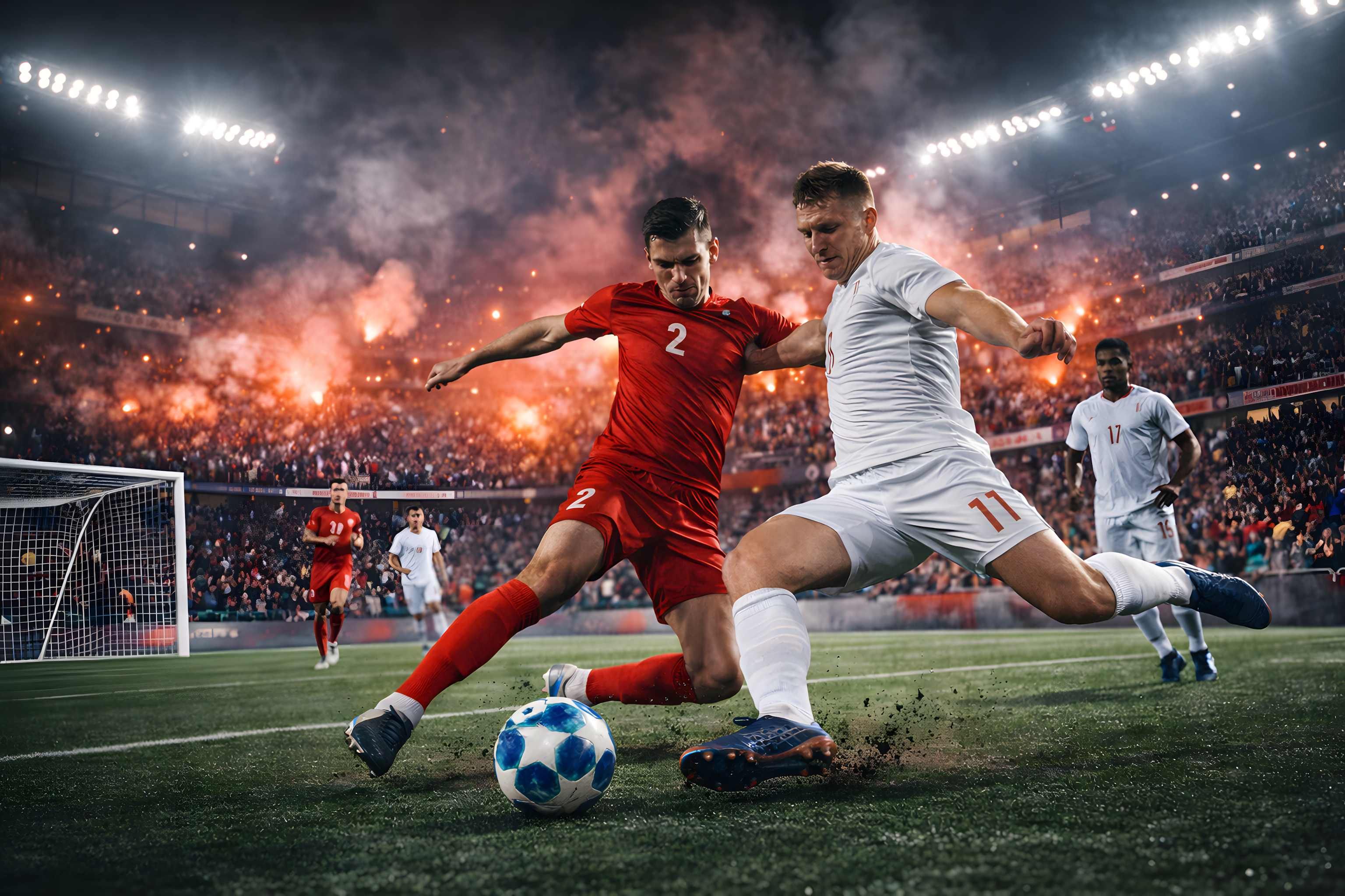 Das Foto zeigt zwei Fußballspieler in einem intensiven Zweikampf auf einem beleuchteten Spielfeld. Der Spieler in roter Uniform versucht, den Ball vor seinem Gegner in weißer Uniform zu erobern. Beide Spieler zeigen Entschlossenheit und Leidenschaft in ihrem Spiel. Das dramatische Flutlicht wirft lange Schatten auf den Rasen und verleiht der Szene eine große Dynamik. Im Hintergrund ist die Tribüne mit Tausenden von jubelnden Fans zu sehen, die das Geschehen auf dem Feld mit Spannung verfolgen. Dieses Foto eignet sich hervorragend für den Einsatz in Sportnachrichten, Fußballberichten oder -präsentationen, aber auch für Social-Media-Beiträge rund um das Thema Fußball. Es vermittelt die Intensität und Emotionalität des Spiels auf eindrucksvolle Weise.