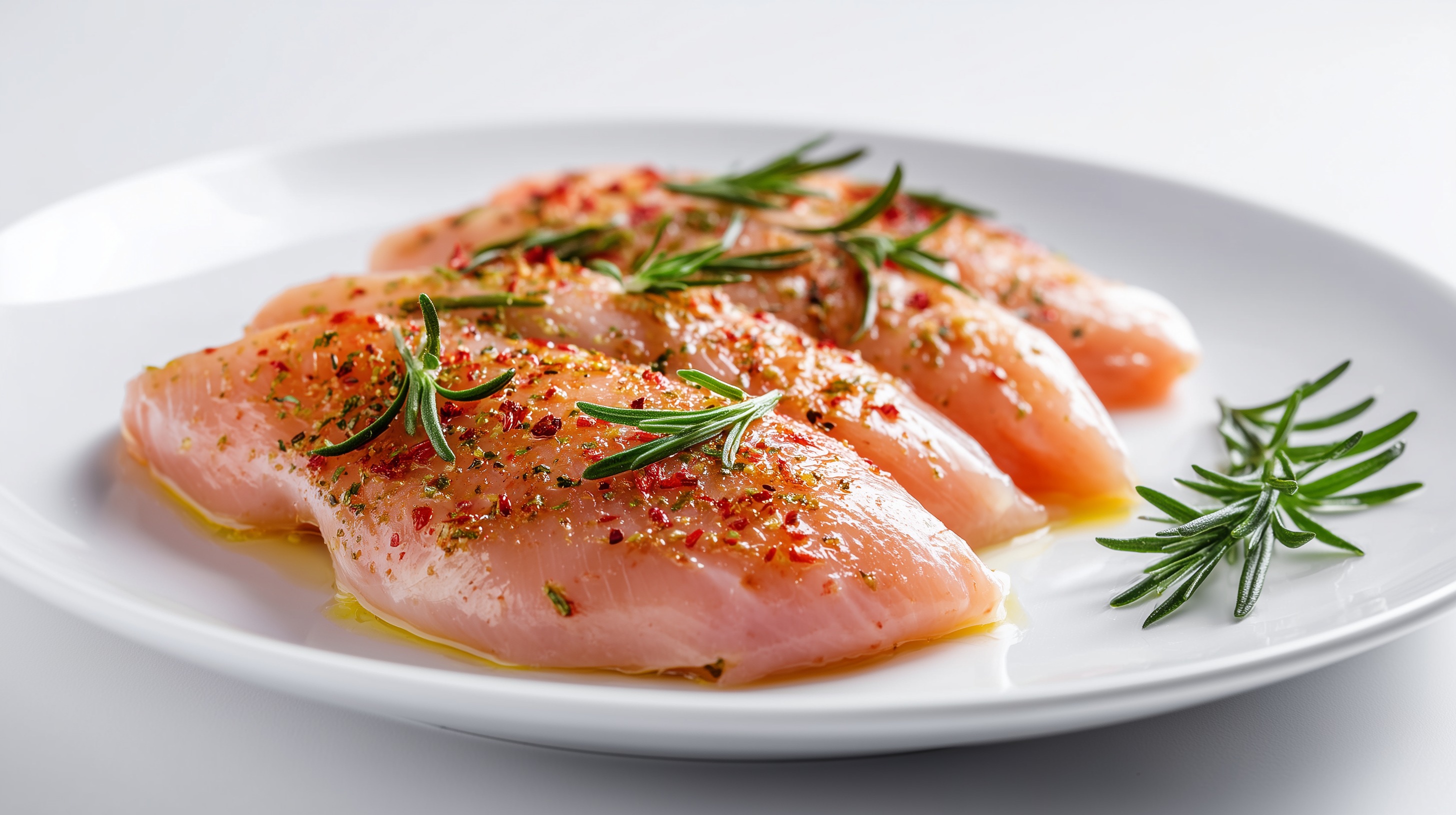 Dieses Foto präsentiert ein appetitliches Lachs-Steak, das mit einer Vielfalt an Kräutern und Gewürzen verfeinert wurde. Der frisch gefangene Lachs ist von einer leicht knusprigen, rostig-roten Kruste überzogen, die einen würzigen Geschmack verspricht. Die Anordnung der Zutaten, wie Rosmarin und Thymian, verleiht dem Gericht eine elegante, natürliche Optik. Das Bild bietet sich hervorragend für den Einsatz in Kochrezepten, Restaurantmenüs, Foodblogs oder Präsentationen an, um den Appetit des Betrachters anzuregen. Durch seine stimmungsvolle Farbgebung und scharfe Fokussierung erzielt es einen professionellen und appetitlichen Gesamteindruck.