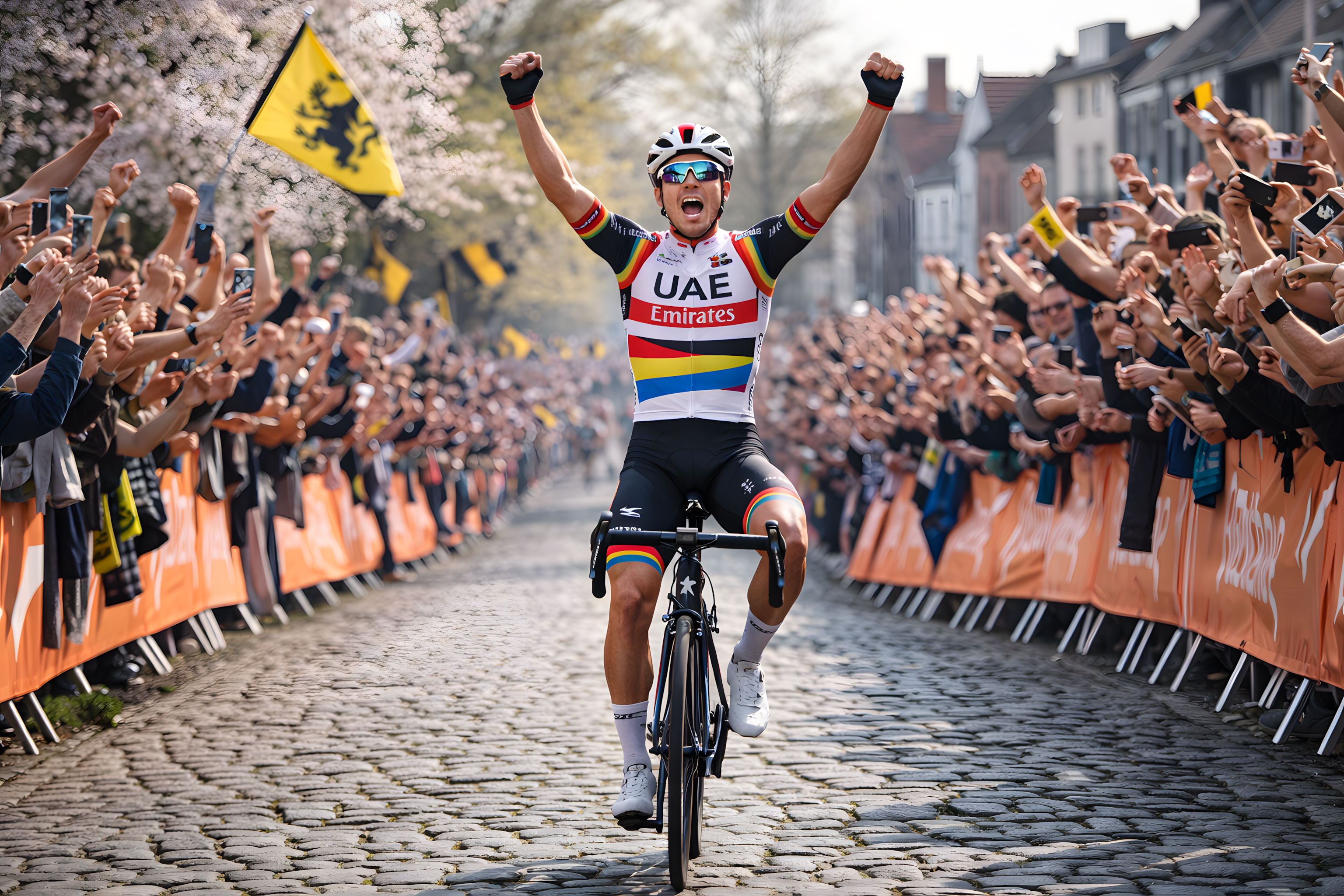 Das Foto zeigt einen Radsportler, der nach einem erfolgreichen Wettkampf über die Ziellinie fährt und mit erhobenen Armen jubelt. Er trägt ein Trikot in den Nationalfarben der Vereinigten Arabischen Emirate und ist sichtlich von seinem Sieg begeistert. Im Hintergrund ist eine Menschenmenge zu sehen, die den Athleten lautstark anfeuert und ihre Freude über den Erfolg teilt. Die Perspektive ist aus Sicht der Zuschauer aufgenommen und fängt die Dynamik und Energie des Moments perfekt ein. Das Bild eignet sich hervorragend für die Verwendung in Sportberichten, Radsport-Blogs, Social-Media-Kanälen oder Newsletter rund um große Radrennen. Es vermittelt Begeisterung, Leidenschaft und den Triumph des Spitzensports.