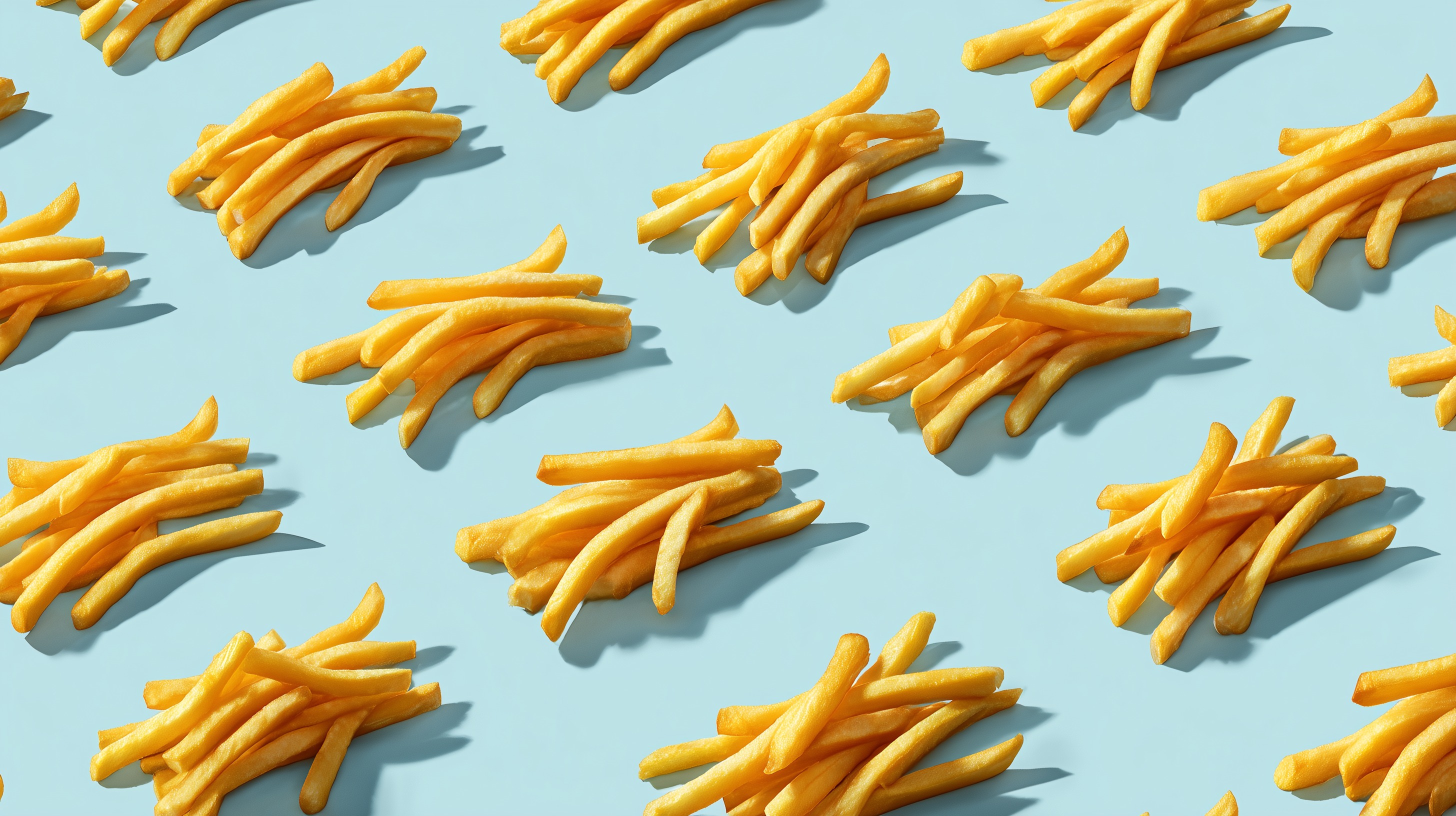 Das Bild zeigt eine detaillierte Aufnahme von köstlichen, goldgelben Pommes Frites, die in einer ordentlichen Reihe auf einem hellblauen Hintergrund angeordnet sind. Die Kartoffelstäbchen haben eine leicht knausprige Oberfläche und werfen weiche Schatten, was der Szene eine Tiefe verleiht. Die satte Farbe und die glatte, gleichmäßige Anordnung der Pommes machen Appetit auf einen leckeren Snack. Dieses Foto eignet sich hervorragend als Eyecatcher für Beiträge in Lebensmittel-Blogs, Social-Media-Posts zu Fast Food oder Präsentationen rund um das Thema Gastronomie. Mit seiner minimalistischen, aufgeräumten Ästhetik sticht es gekonnt aus der Masse hervor.
