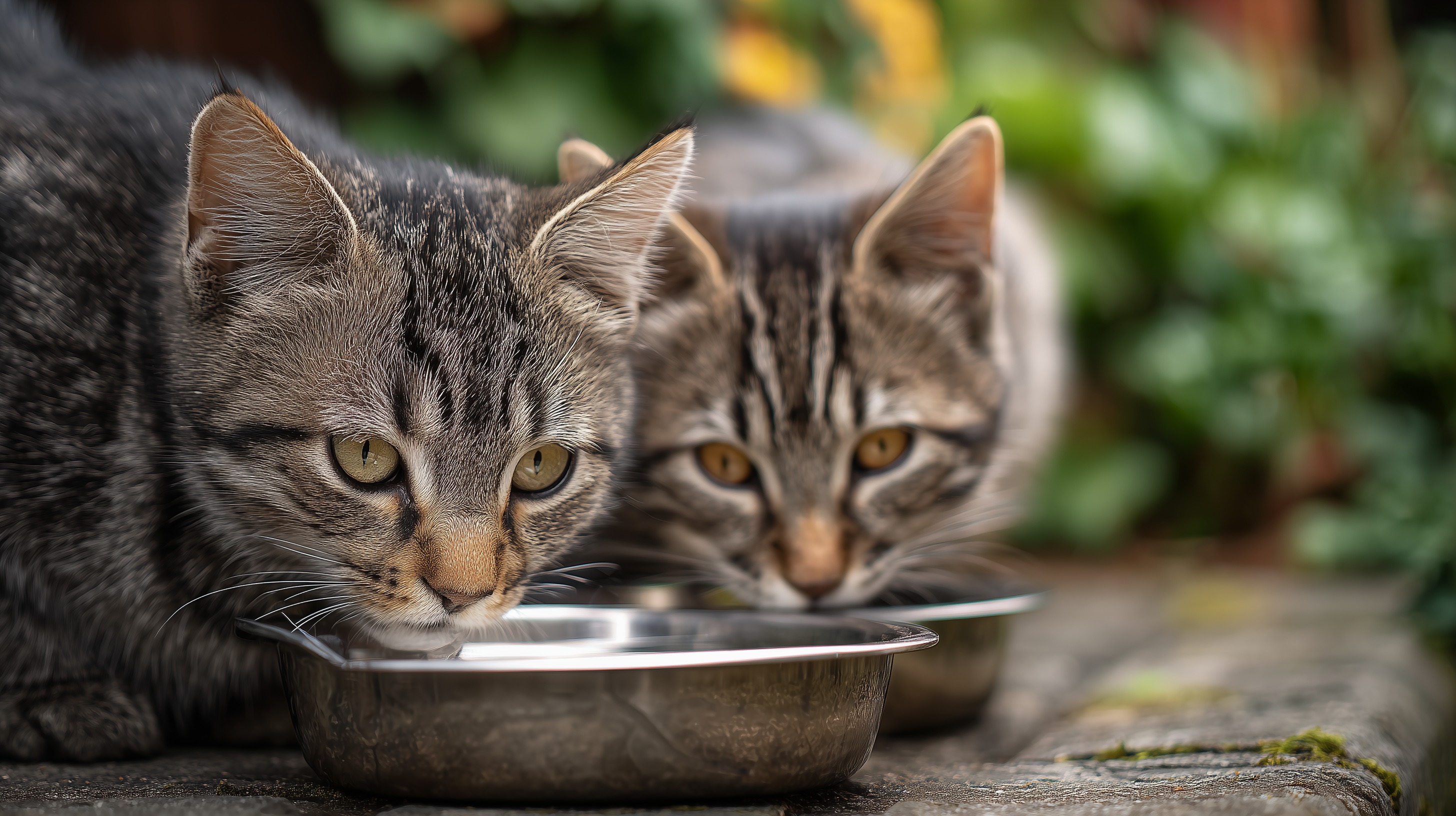 Das Foto zeigt zwei niedliche Kätzchen, die gemeinsam aus einer Metallschüssel fressen. Die Tiere haben ein weiches, flauschiges Fell in verschiedenen Grautönen und ihre großen Augen sind konzentriert auf ihre Mahlzeit gerichtet. Die Katzen sind in einer natürlichen, ländlichen Umgebung platziert, mit verschwommenem Hintergrund aus Pflanzen und Laub. Die Aufnahme ist aus einer leichten Untersicht aufgenommen, was den Betrachter näher an die Tiere heranrückt und eine vertraute Perspektive schafft.