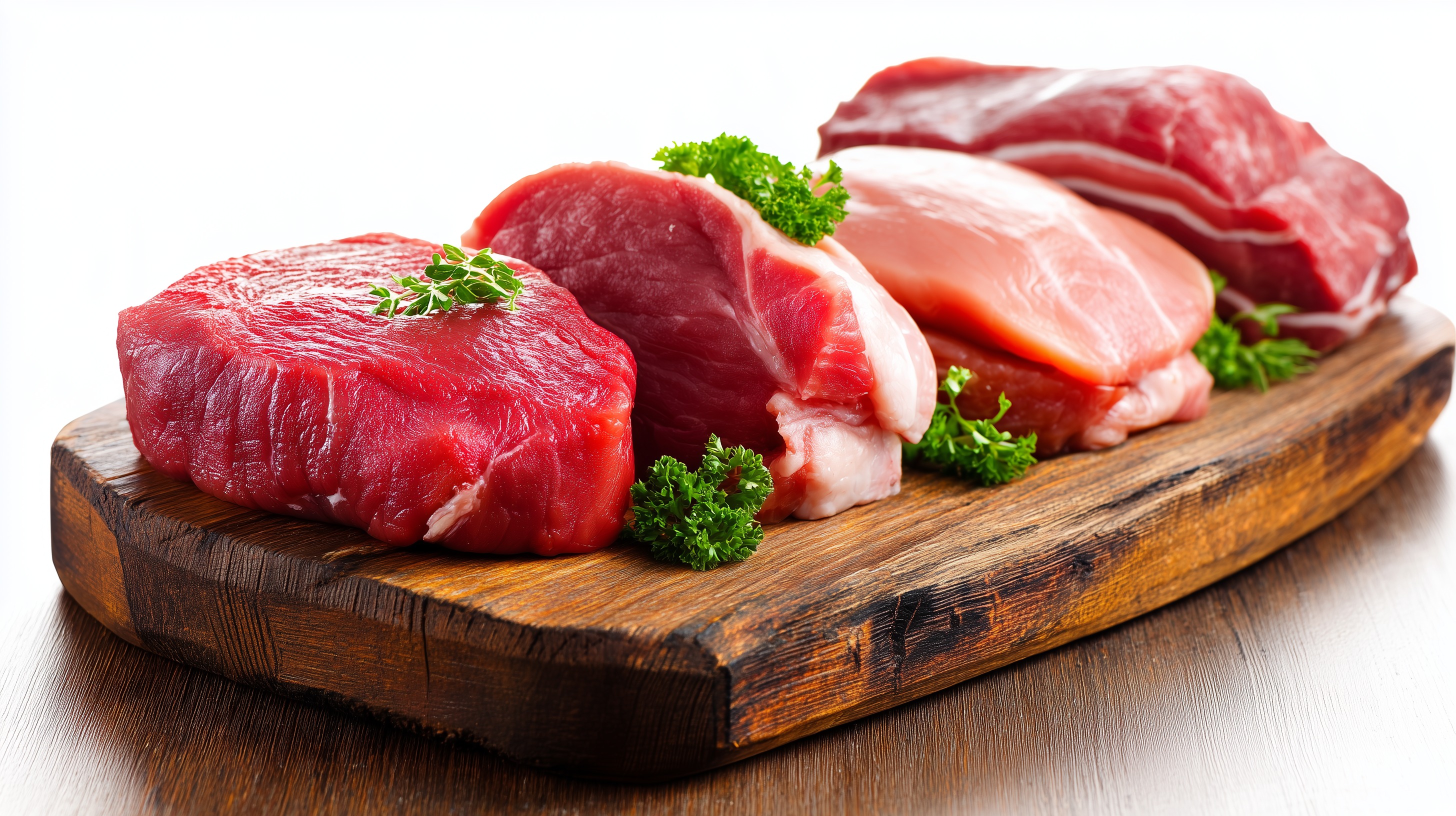 Auf einem rustikalen Holzbrett präsentieren sich köstliche Fleischstücke: saftiges Rindfleisch, zarter Schinken und leckere Wurst. Die Anordnung ist appetitlich und lädt zum Genuss ein. Die roten Farbtöne und die natürliche Holzoptik schaffen eine warme, kulinarische Atmosphäre. Dieses Foto eignet sich hervorragend für Rezeptblogs, Kochbücher, Social-Media-Posts oder als Begleitmotiv für Präsentationen rund um das Thema Fleischzubereitung und gehobene Gastronomie. Mit seinem Premium-Charakter vermittelt das Bild Hochwertig-keit und Frische - perfekt, um den Appetit des Betrachters anzuregen.