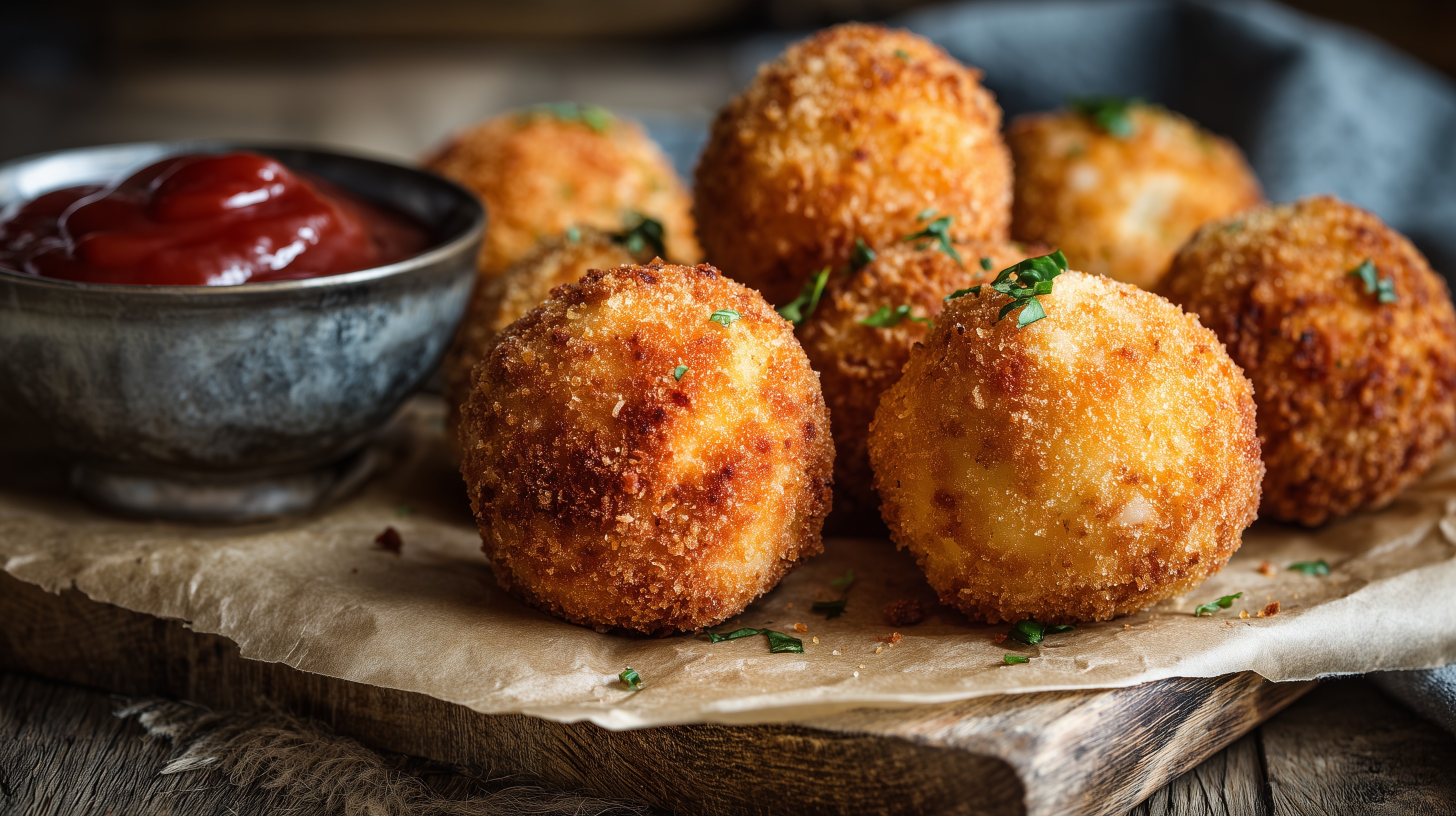 Dieses Foto zeigt eine Auswahl köstlicher Brezelknödel, die auf einem rustikalen, hölzernen Untergrund angerichtet sind. Die goldbraun gebackenen Knödel sind mit feinen, grünen Kräutersprenkeln dekoriert und werden von einer Schale mit aromatischem Tomatendip begleitet. Die warmen Farben, die appetitanregende Optik und die knausprige Oberfläche der Brezelknödel machen Lust darauf, diese leckere Speise zu probieren. Solch eine Anrichtung eignet sich perfekt als Fingerfood für gesellige Anlässe wie Weihnachtsfeiern, Familienfeste oder den Oktoberfest-Besuch. Das Foto könnte beispielsweise in einem Blog-Beitrag über bayerische Spezialitäten, in einem kulinarischen Social-Media-Kanal oder in einem Newsletter mit Partyrezepten verwendet werden.